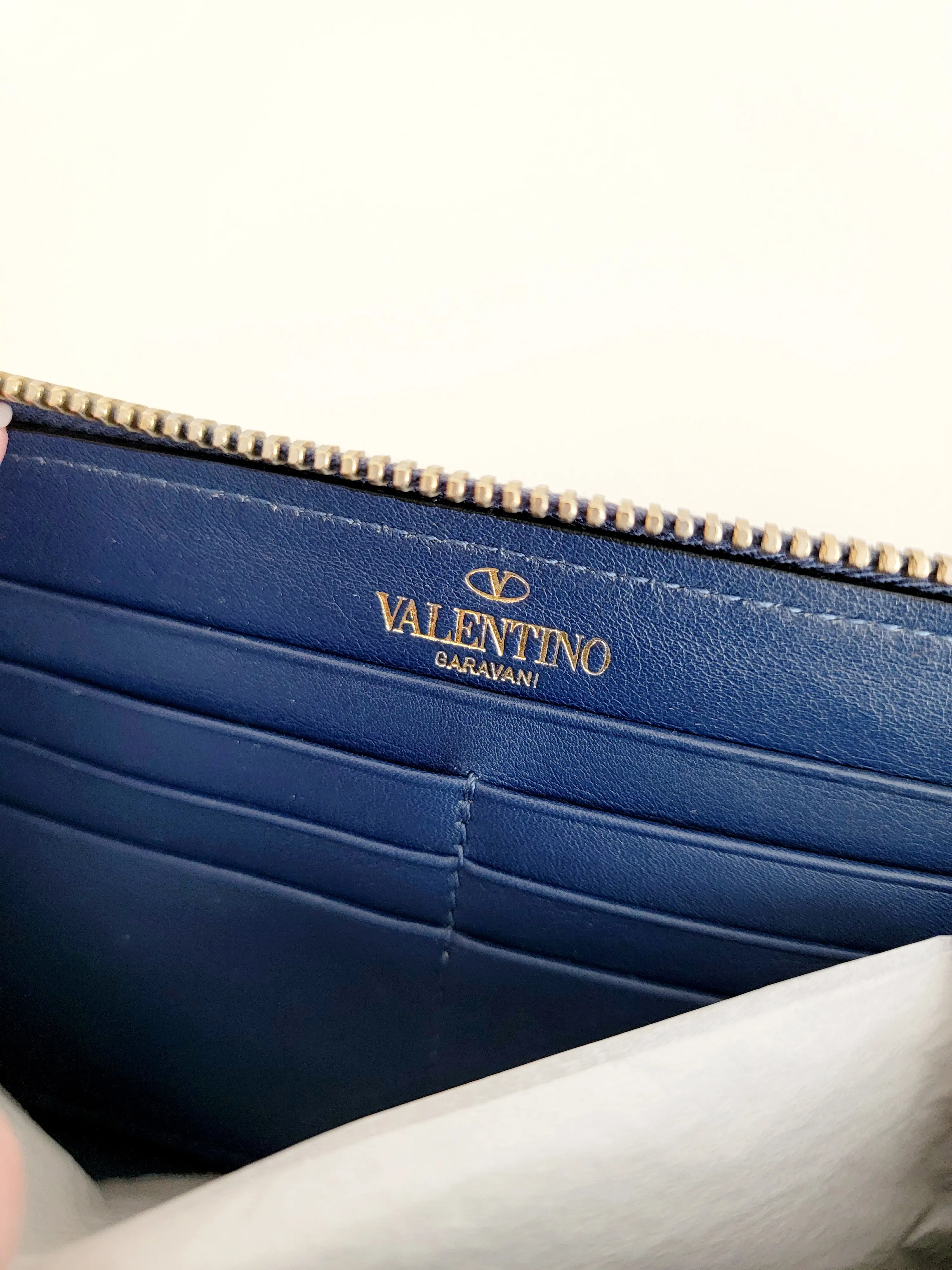 Tolles Valentino Garavani Rockstud Portemonnaie in einem schönen pastelligem Blauton. Das Leder ist in sehr gutem Zustand, ohne nennenswerte Gebrauchsspuren. Der Reissverschluss gleitet tadellos. Innen ist das Portemonnaie in ausgezeichnetem Zustand. Die Nieten sind nicht mehr sehr glänzend, haben feine Kratzer und sind ein wenig matt geworden. Inklusive Entrupy Zertifikat.