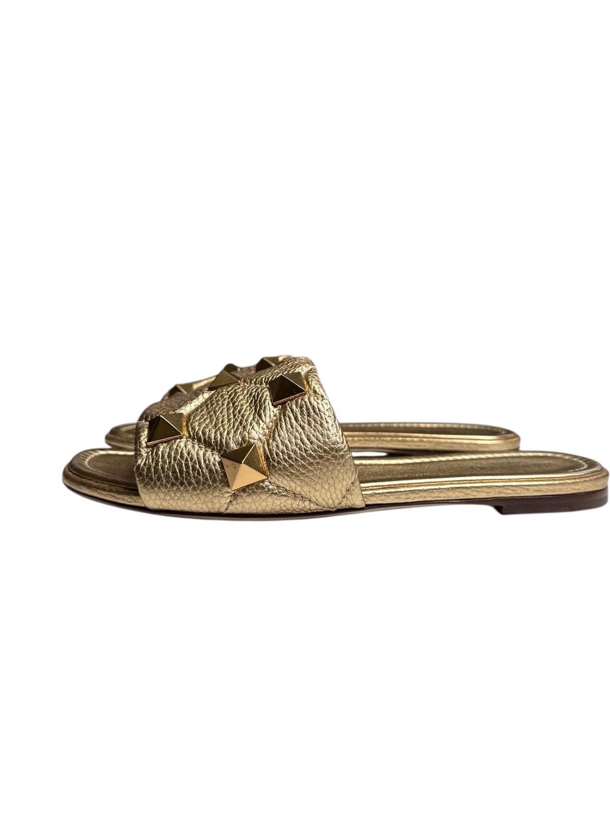 These Valentino Garavani sandals are a modern and bold reinterpretation of the iconic codes of the Italian House. Crafted in metallic gold-finished leather, these sandals feature a wide quilted strap with a diamond pattern highlighted by tonal signature studs. This model is the perfect piece to brighten up a summer outfit, whether it's a flowing dress or a linen ensemble.
