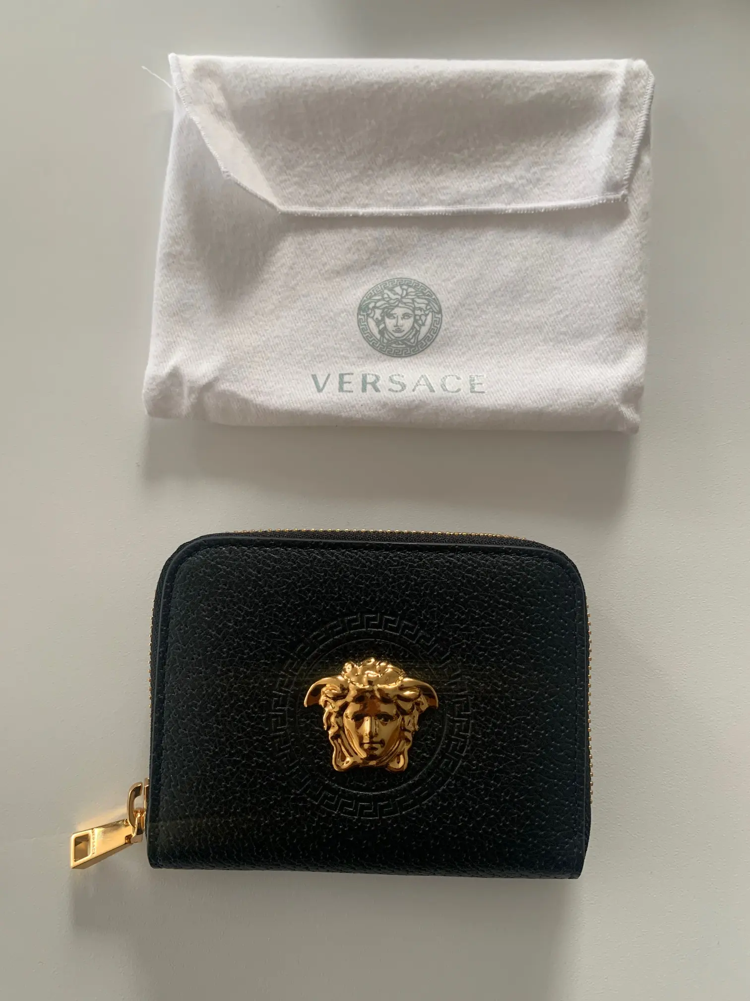 Versace Medusa Geldbörse – Schwarzes Leder – Neu Edle kleine Geldbörse von Versace aus hochwertigem schwarzen genarbten Leder. Im Zentrum strahlt der ikonische goldene Medusa-Kopf, umgeben vom klassischen Greca-Muster (griechischer Mäander). Die kompakte Börse wird mit einem goldenen Reissverschluss geschlossen und eignet sich perfekt als Münzbörse, für Karten oder als praktisches kleines Portemonnaie in jeder Handtasche. Zustand: Neu (unbenutzt). Masse: ca. 11 cm × 8 cm × 2 cm (Breite × Höhe × Tiefe) Lieferumfang: Geldbörse inklusive originaler schwarzer Versace Box Ein echtes Statement-Accessoire mit hohem Wiedererkennungswert – luxuriös, kompakt und zeitlos elegant!