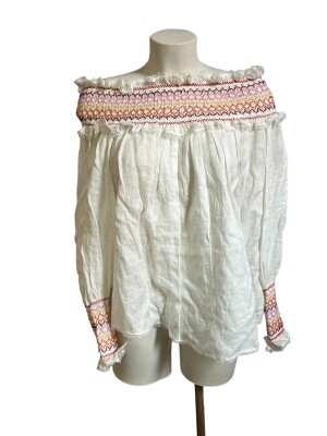 This blouse is made of lightweight white linen, ideal for hot climates. It features a Bardot neckline (off-the-shoulder) with embroidered smocking that provides great elasticity and a comfortable fit.