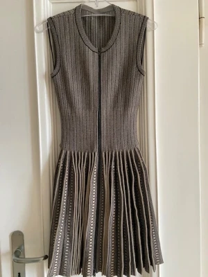 Alaia Mini Kleid ärmellos mit Reissverschluss auf der Frontseite. Reissverschluss beidseitig, sodass sich der Ausschnitt und untere Schlitz beliebig weit öffnen / schliessen lassen (siehe Bilder). Farbe: Braun / schwarz. Plissierter unterer Part.