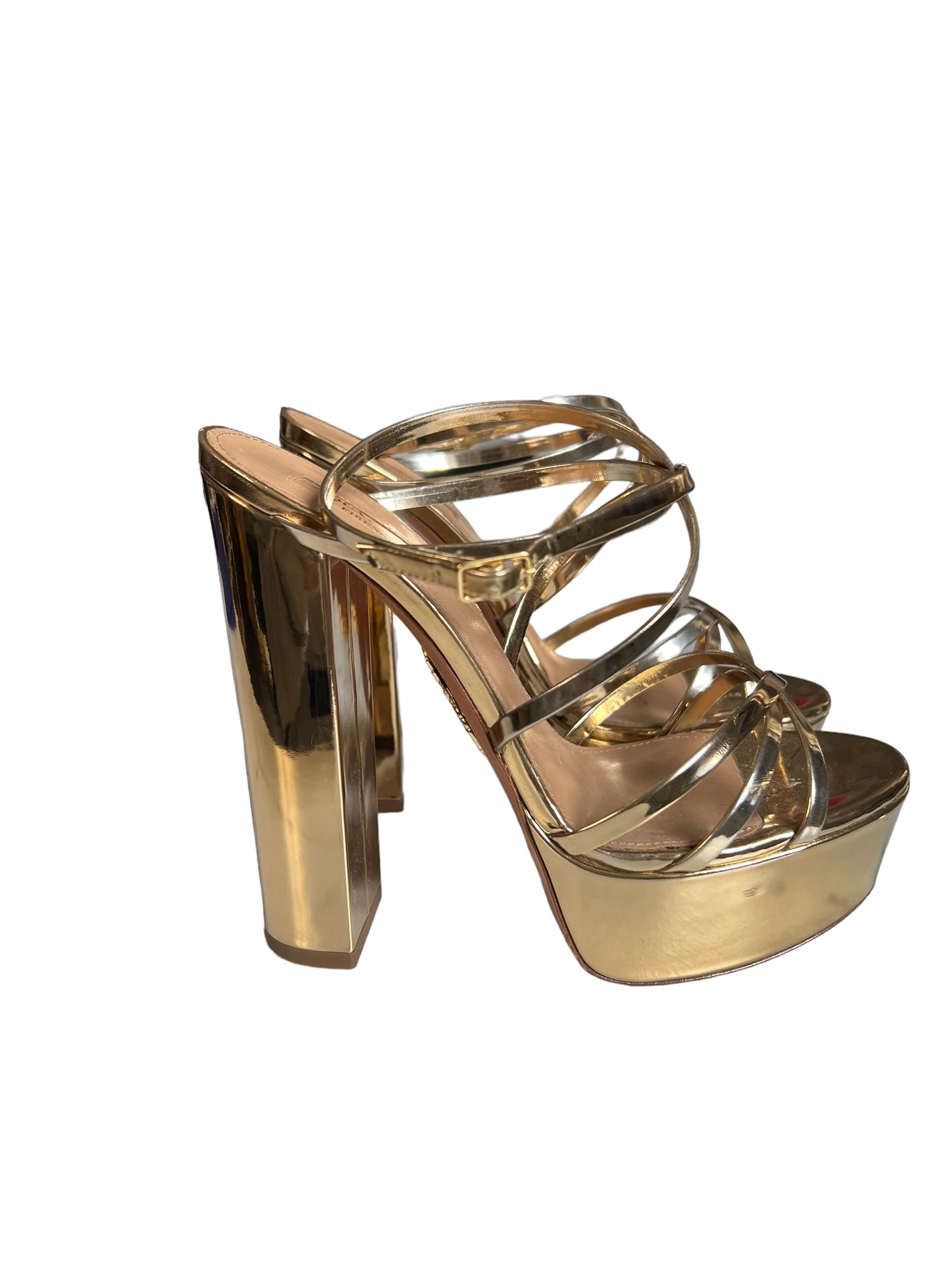 Heeled sandals, characterized by a sophisticated cage design. They are made of metallic golden leather and the front is composed of multiple straps that crisscross and go up to the ankle. The heel is high and the platform is thick, making them both elegant and comfortable.