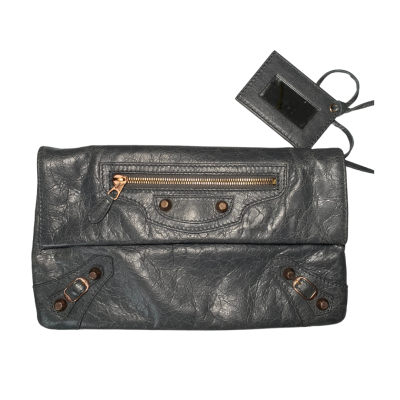 Adopt an urban and chic look with this Balenciaga clutch, a centerpiece of the brand's bold aesthetic. Crafted from soft and textured deep anthracite gray leather, it stands out with its metallic details that give it a strong identity. The copper-colored zippers and decorative studs elegantly contrast with the material, while a matching leather tag adds a touch of polished finish.