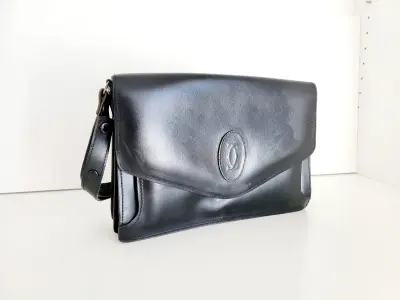 Vintage Tasche von Cartier. Die Tasche hat eindeutige Gebrauchsspuren, v.a. hat sie diverse „Schmieren“. Vermutlich wurde versucht Flecken „wegzuputzen“
