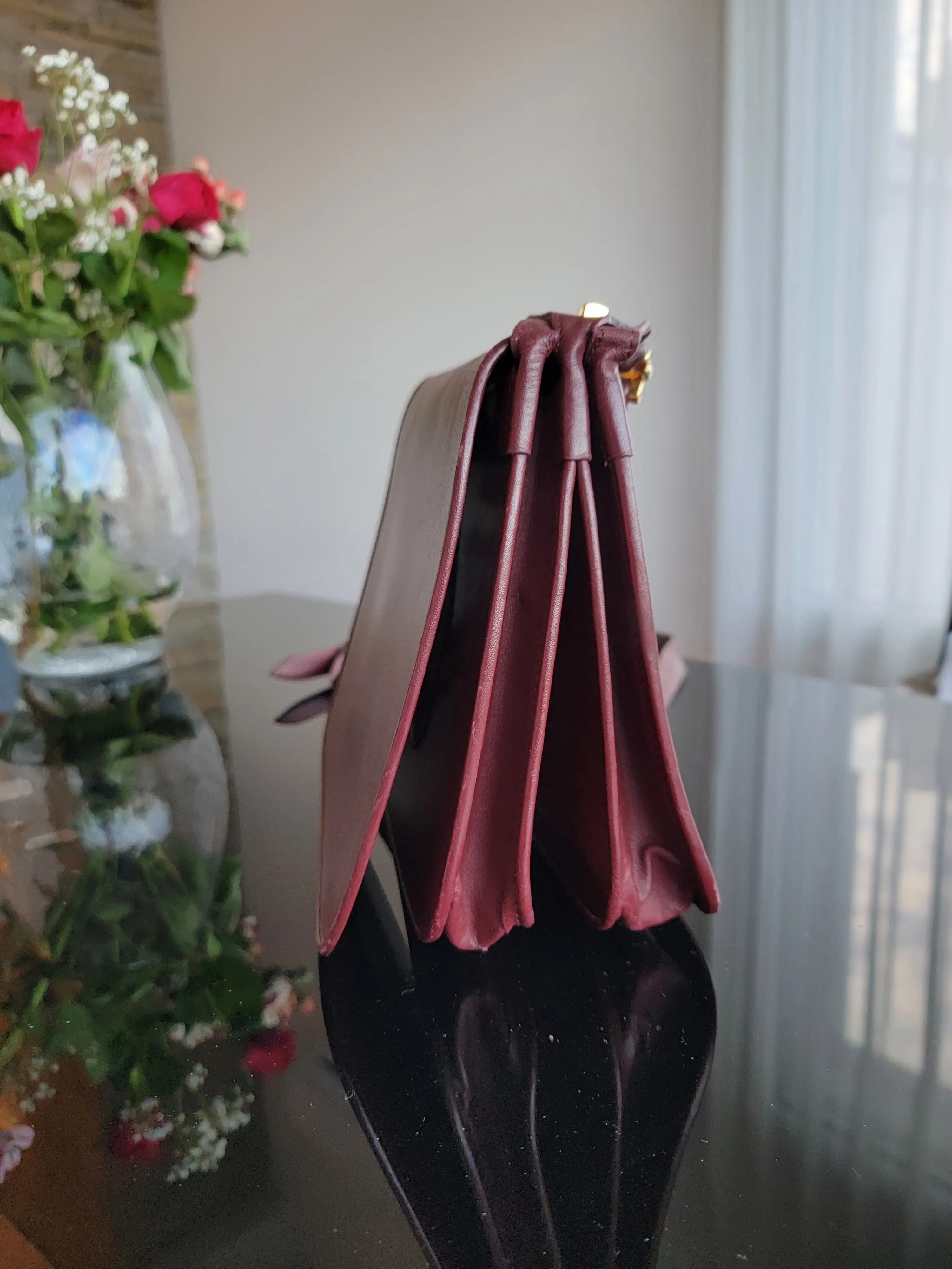Cartier "Must de Cartier" Umhängetasche aus Bordeaux farbenem Leder. Die Tasche wiest geringe Gebrauchsspuren an den Kanten auf, gemäss Fotos. Ansonsten ist sie in einem top Vintage Zustand.
