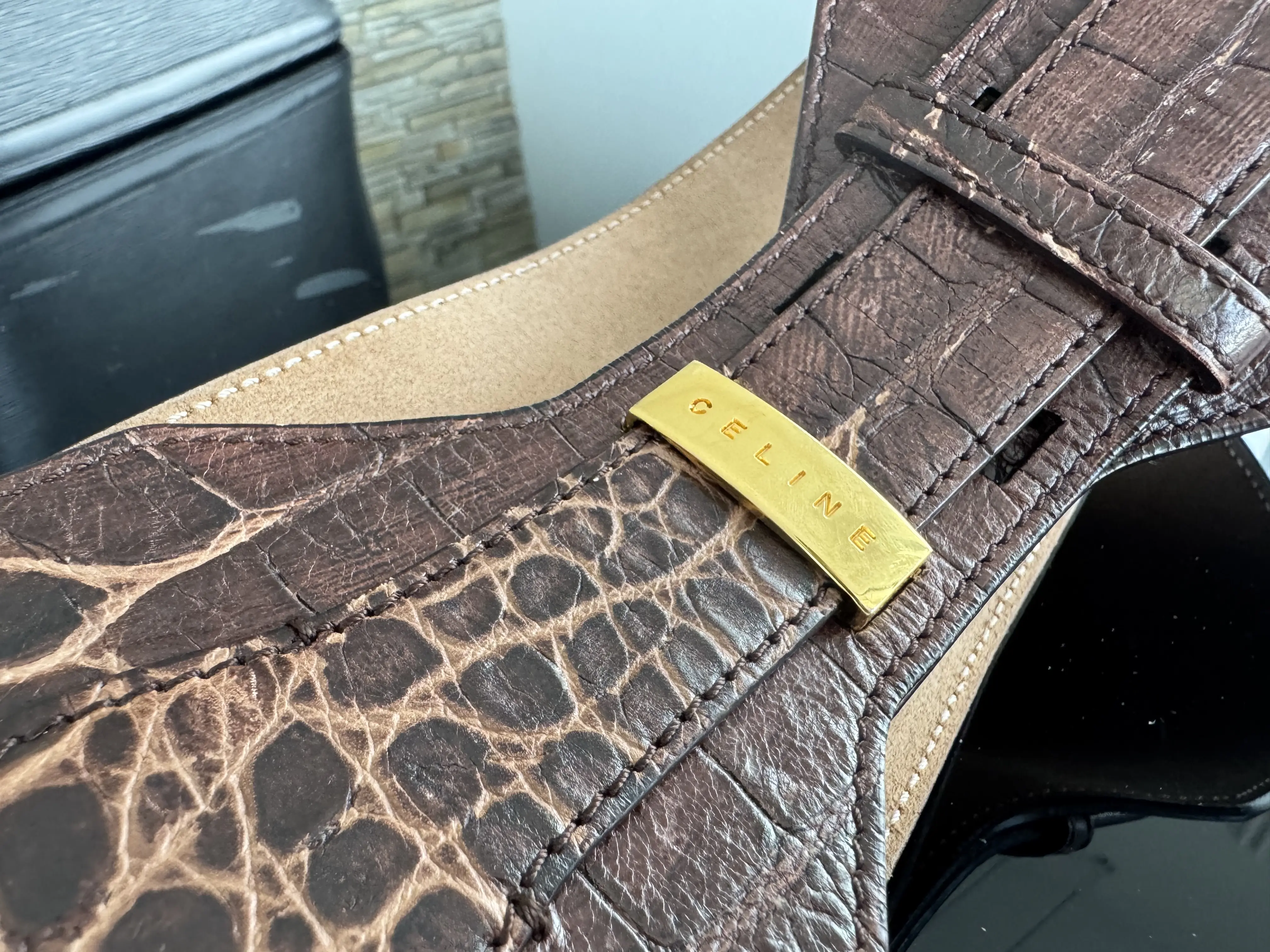 Breite Celine Gürtel für die Taille. Das Leder ist in ausgezeichnetem Zustand, sowie die goldige Hardware. Der Gürtel weist keine nennenswerten Gebrauchsspuren auf und ist eine echte Rarität. Breite: 9.5 cm