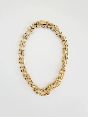 Die goldige Beschichtung dieses sportlich-schicken Collies ist stellenweise stark abgefärbt, sodass es an manchen Stellen goldig, an machen silbrig ist. Die Kette ist eher grob und schwer. Es ist einfach oder doppelt tragbar oder sogar als Gurt/ Bauchkette einsetzbar
