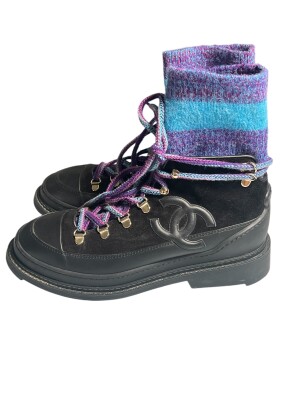 These Chanel shoes are high-top boots, inspired by hiking design. They are made of black leather, with suede inserts and a reinforced toe. The Chanel logo is embossed on the side. The thick laces, in various colors, crisscross through metal eyelets. The ankle collar, with a striped "sock" look in shades of purple and blue, adds a touch of color and comfort.