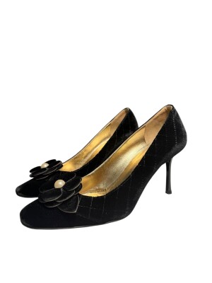 Add a touch of ultimate sophistication to your look with these elegant Chanel pumps. Crafted in soft black velvet, they feature the iconic Maison's quilting. The subtle square toe and stiletto heel offer a classic and refined silhouette. Each shoe is adorned with a velvet Camellia flower, Chanel's signature, centered with a pearly bead. Perfect for an evening or special event, these pumps embody timeless elegance.