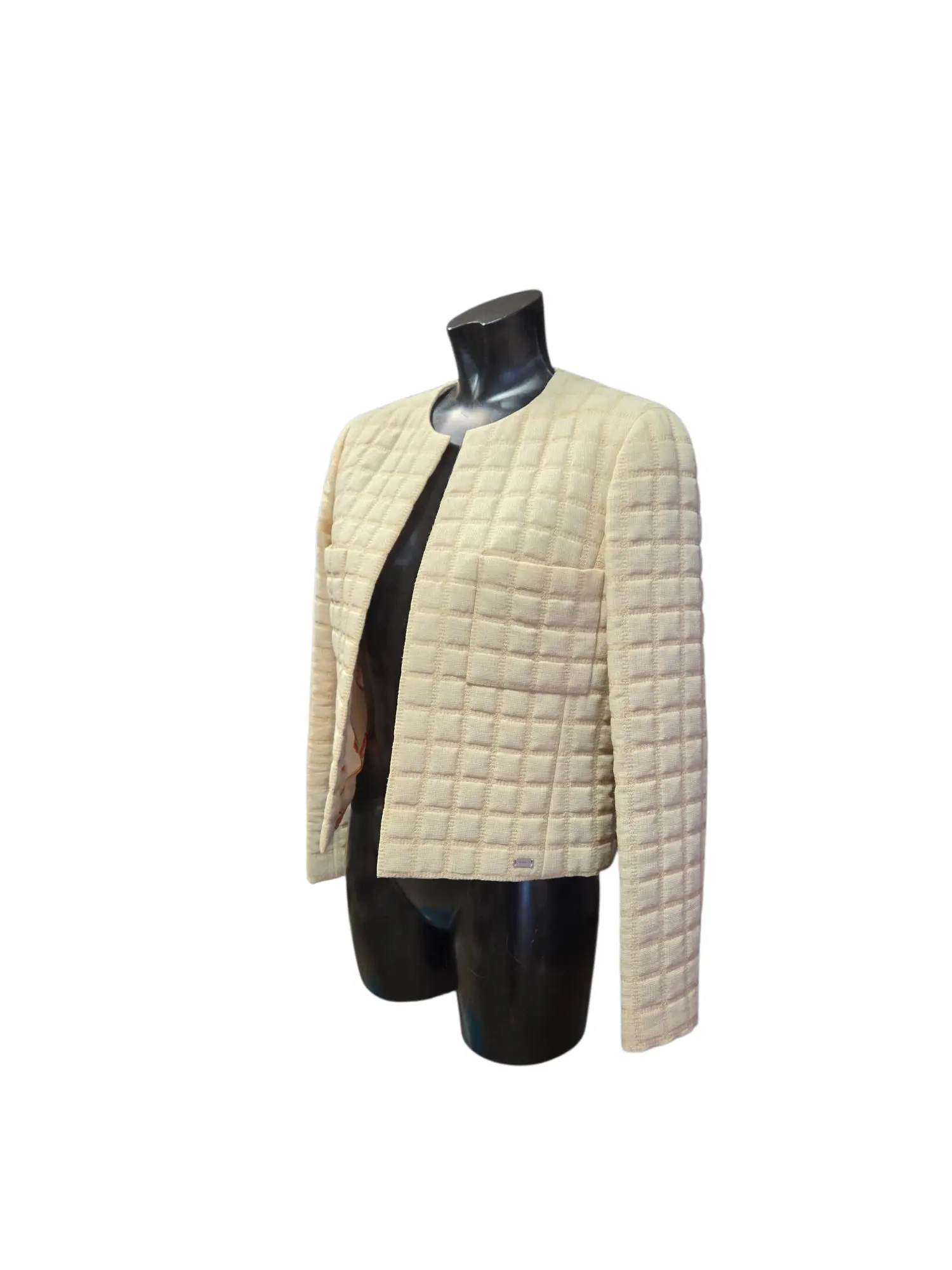 ▪︎Condition: Excellent condition ▪︎Material: 38% wool, 21% viscose, 16% polyester, 11% nylon, 10%silk, 4 % cotton ▪︎Color: Beige ▪︎Size: Label size Fr 42 (fits for EU 38/40) Details: ▪︎Arm length: 60 cm ▪︎Length: 54 cm ▪︎Shoulder width: 42 cm Chest width: 48 cm ●Chanel jacket from 2000 collection ●Front open/ no closure ●2 front pockets ●Lining 100% silk ●Lining with image of Coco Chanel face ●Long sleeves ●Shining treads