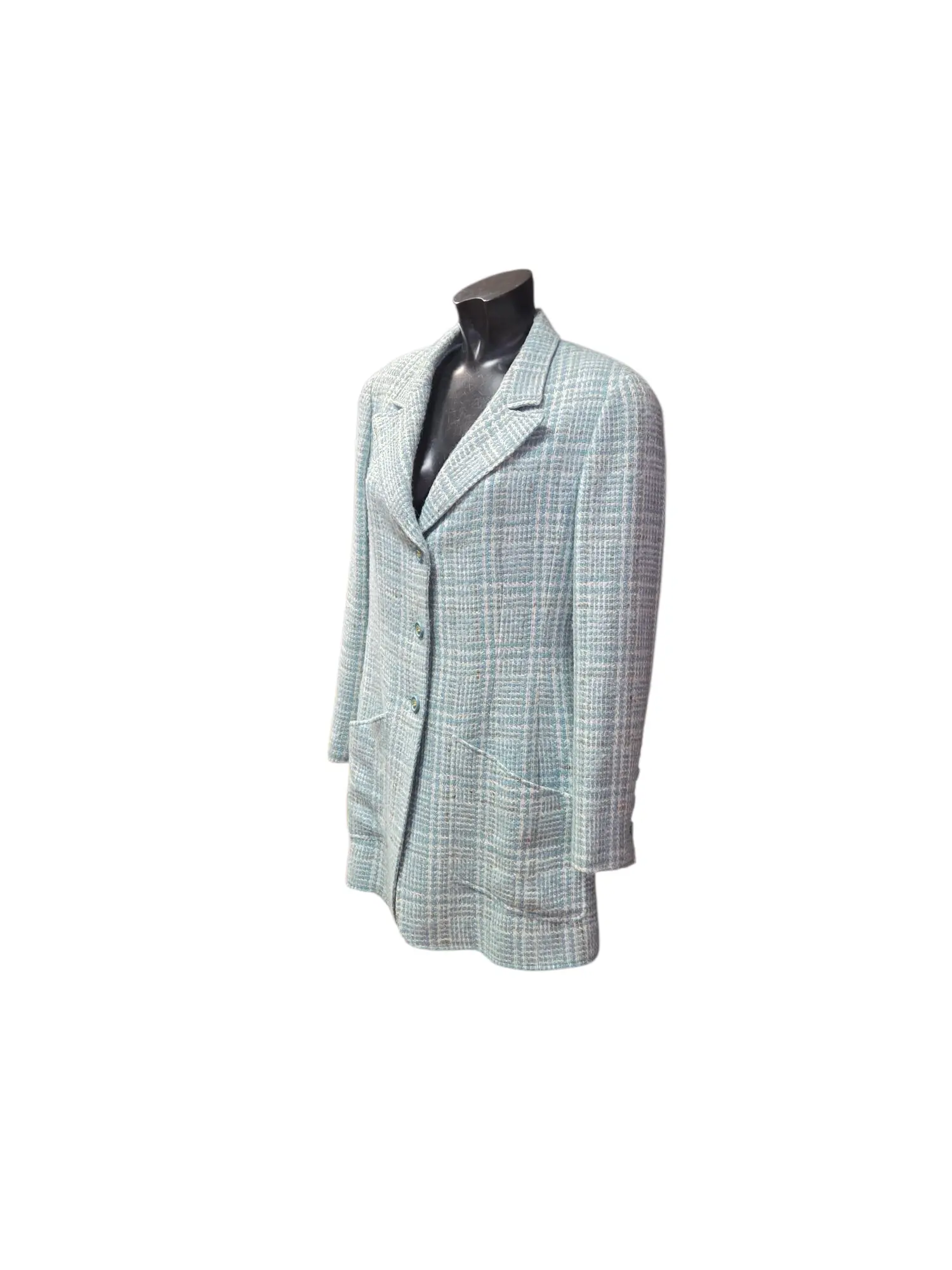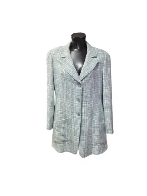 Condition: Very good condition Material: 47% wool, 44% acrylic, 4% rayon, 3% moher, 2%nylon Color: Light blue/white/oker Size: 40 (Fr 44) Details : Arm length: 59 cm Length: 80 cm Shoulder width: 42 cm Chest width: 53 cm -Chanel tweed jacket -Button logo closure -2 front pockets -3 buttons with logolining 95% silk, 5% elastan with chanel logolong slevees -Vintage-collection 1997