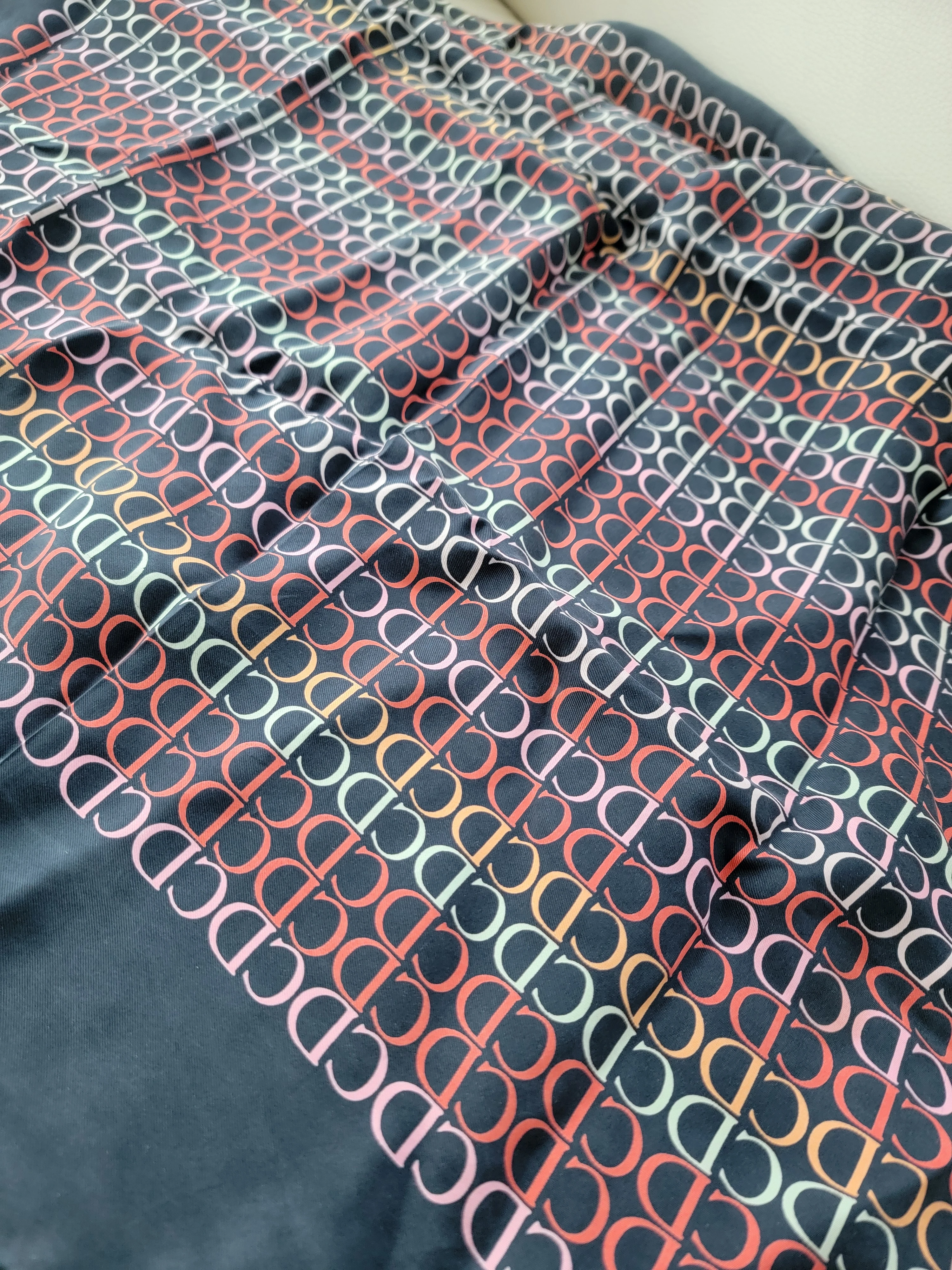 Schönes Seiden-Foulard von Christian Dior mit handgesäumten Kanten. Die Grundfarbe ist dunkelgrau/ dunkelblau.