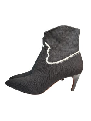 Black knit ankle boots, characterized by an elegant and modern design. The dark-colored heel is thin and curved, giving them a sophisticated look.