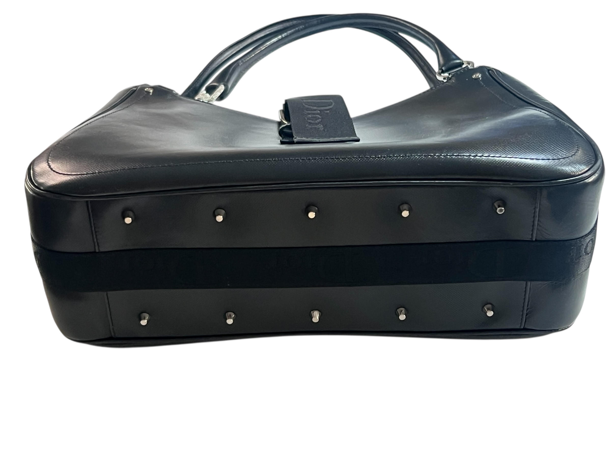A rare vintage treasure. This black leather Dior bag, from the creative era of the early 2000s, is the definition of bold glamour. Its classic silhouette is enhanced by unique details, including a spectacular jewel carabiner paved with rhinestones. This precious and unexpected detail transforms the bag into a true collector's piece.