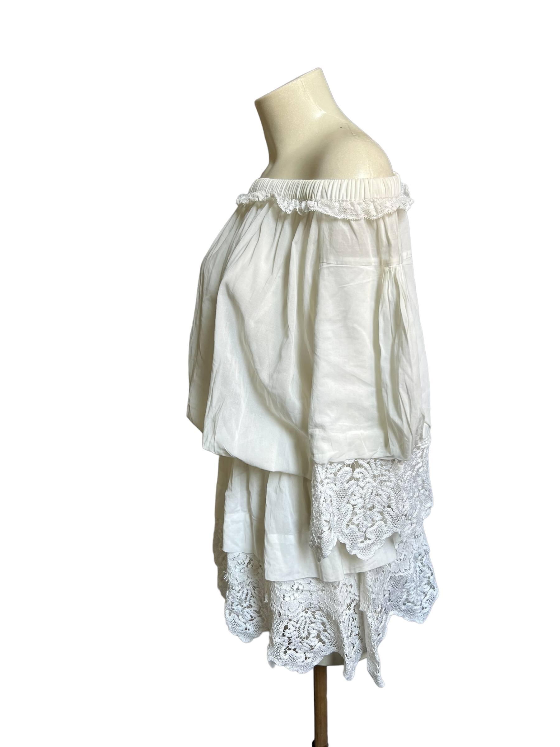 This dress is made of white cotton voile, offering a light and airy texture. The Bardot cut highlights the upper body and is accentuated by an elastic band and a delicate ruffle. The bust is slightly gathered and the waist is defined by an elastic band that creates a feminine silhouette.