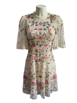 This beautiful Needle & Thread dress is a true work of art, entirely embroidered with delicate floral patterns in powdery tones (pinks, greens, beiges) and embellished with a multitude of sparkling beads and sequins. Its short and flared cut, high neck, and slightly puffy short sleeves in sheer tulle offer a look that is both romantic and sophisticated.