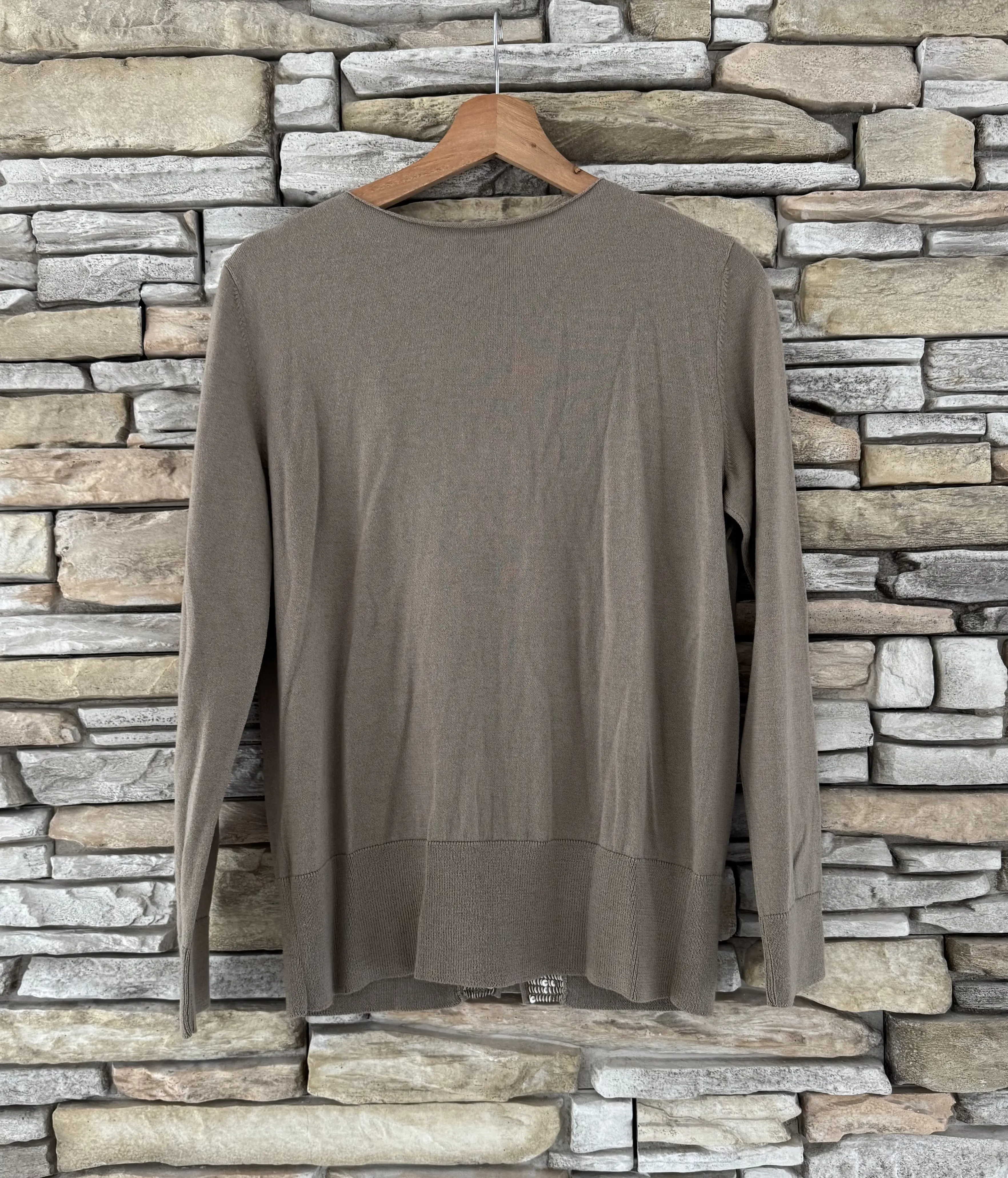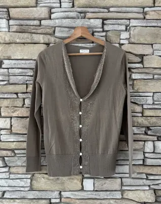 Edler Dries Van Noten Cardigan mit Pailletten besetzt. Kaum getragen und in hervorragendem Zustand. Die Farbe ist "taupe". Brust: 48cm, Rückenlänge: 59cm. Schultern: 40cm. Materialzusammensetzung ist nicht mehr vorhanden, es könnte jedoch ein Baumwolle-/ Seidengemisch sein.