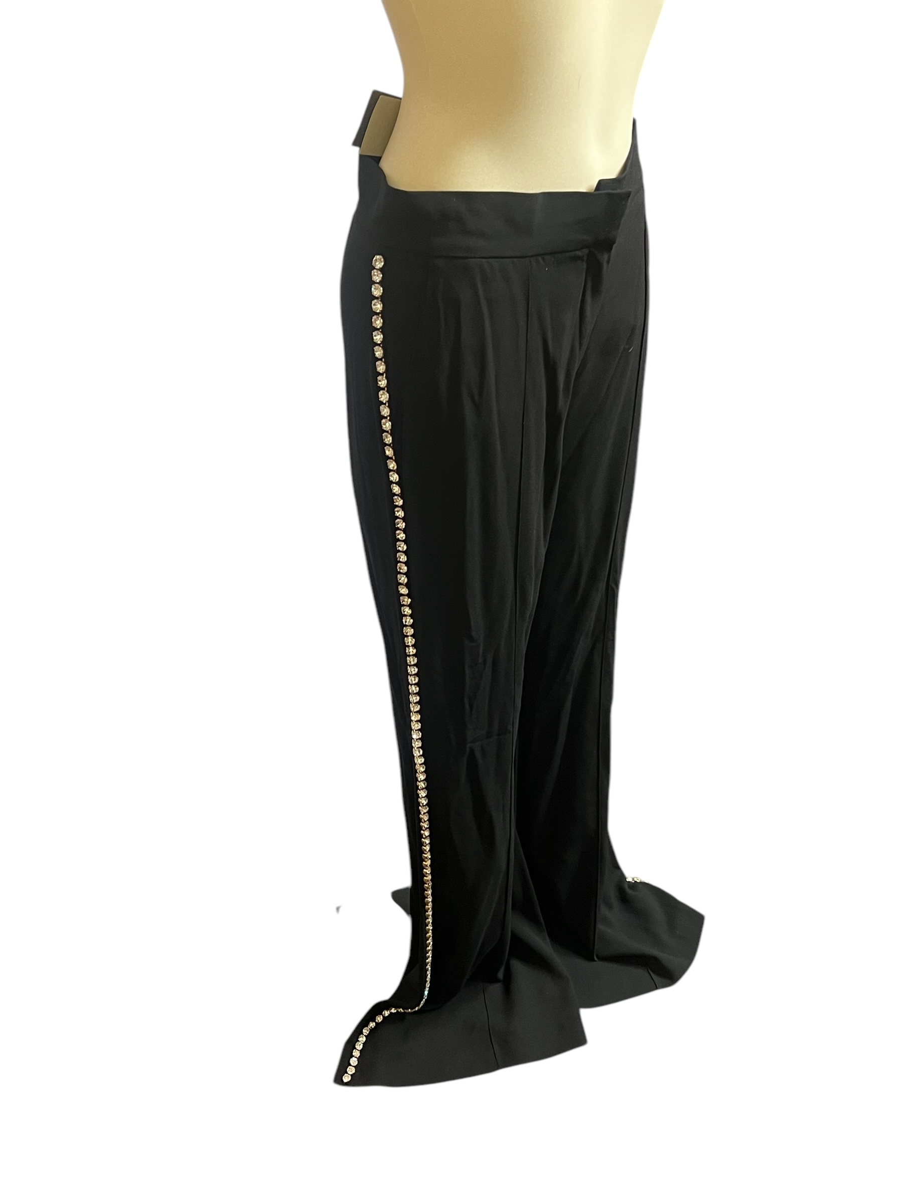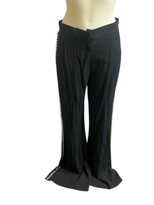 What makes this piece unique is its side stripe: a vertical band adorned with small metallic embellishments that runs the entire length of the leg. These shiny details add a touch of glamour and light to the overall look.