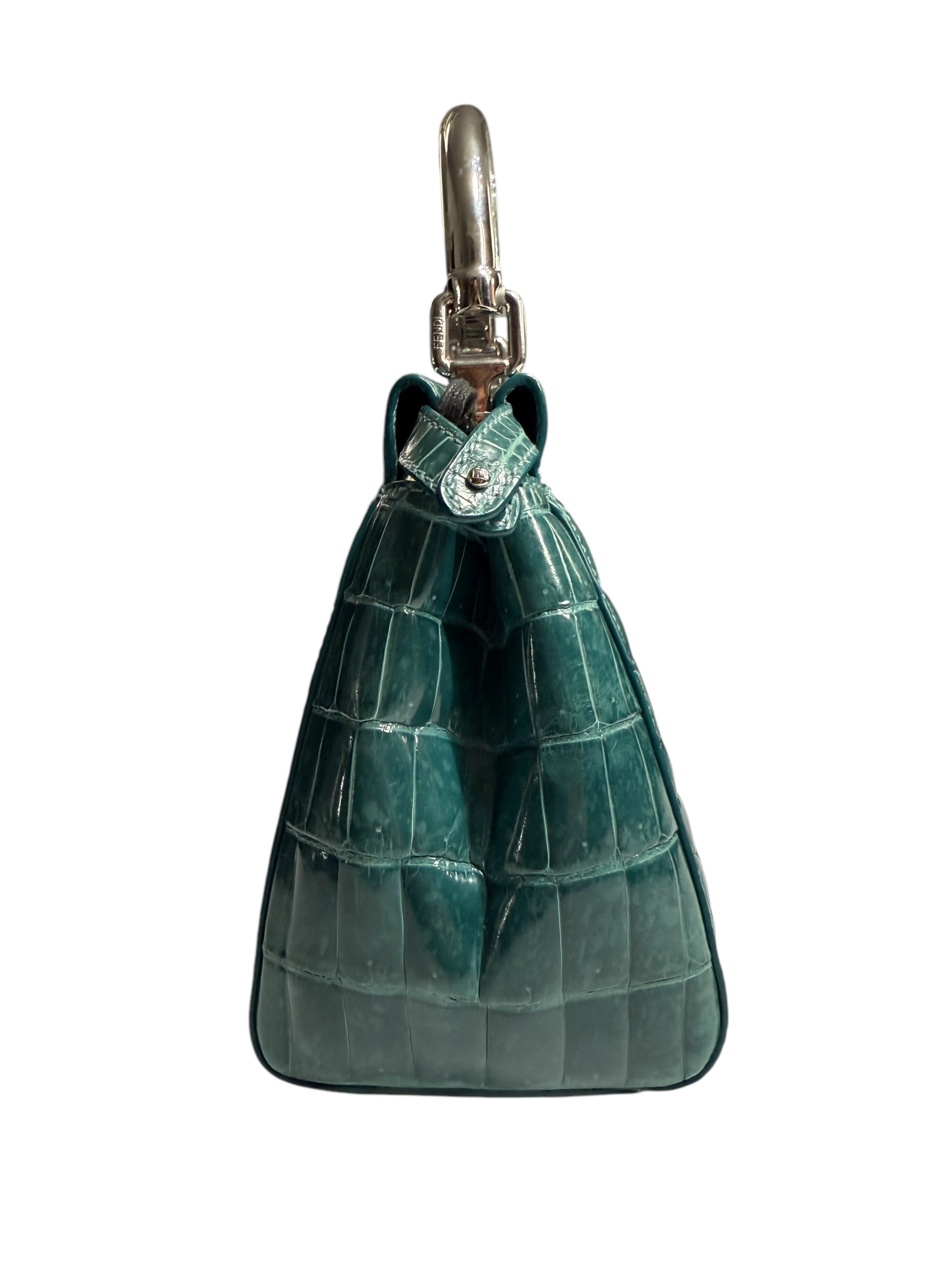 This Fendi bag, the mini Peekaboo, is an iconic piece recognizable by its structured and elegant silhouette. It is crafted from luxurious crocodile leather in a blue-green color. The piece is enhanced by its two rigid silver metal handles and its iconic twist lock closure.