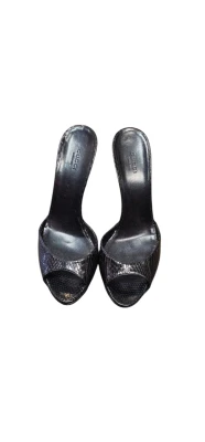 How splendid are these sandals from Gucci! They come designed with a single strap made from exotic snakeskin in a classic black shade which just adds to the beauty of the pair. The slides carry leather insoles and a set of 10 cm heels artistically sculpted in the shape of bamboo. Hardware: Gold-tone Lining Material: Leather Exterior Material: Snakeskin Heel Size: 10 CM Size: 39.5 Insole Material: Leather Sole Material: Leather Origin: Italy Outsole Length 23.5 cm Outsole Width 8 cm