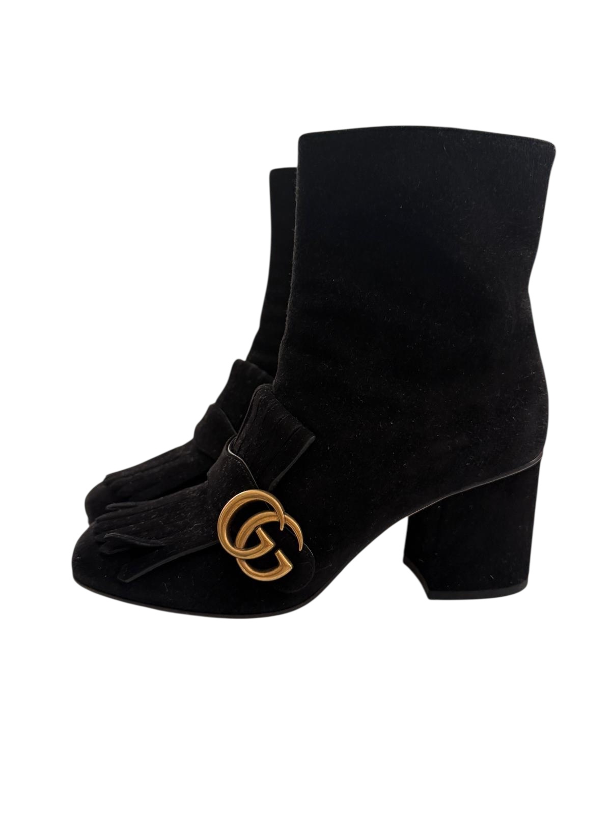 The design is enhanced by the signature details of the Marmont line: a fringed tongue on the instep and the iconic "Double G" logo in aged gold metal finish. A side zipper ensures easy on and off. These ankle boots are a modern classic, perfect for elevating a pair of jeans or completing a more dressed-up outfit.