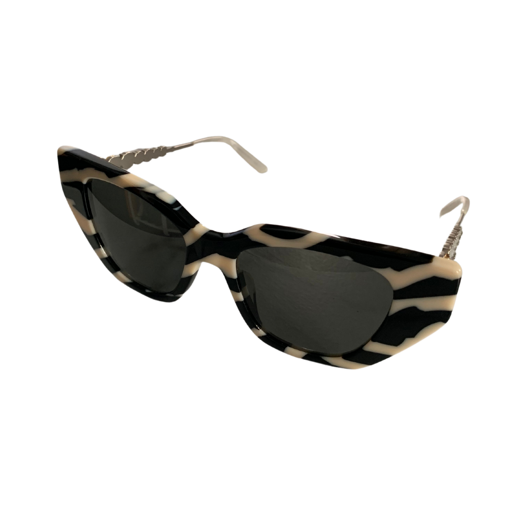 These Gucci sunglasses stand out for their zebra-patterned frame, combining black and off-white for a bold and graphic style. Their cat-eye shape, both retro and modern, enhances the look. The thin branches, with their twisted detail, add a touch of unique sophistication.