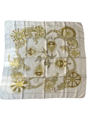 Refined and luminous, this Hermès silk square scarf plays on a baroque composition of flowers and arabesques in golden tones on an ivory background. An elegant piece that brings brilliance and sophistication. 90x90 cm