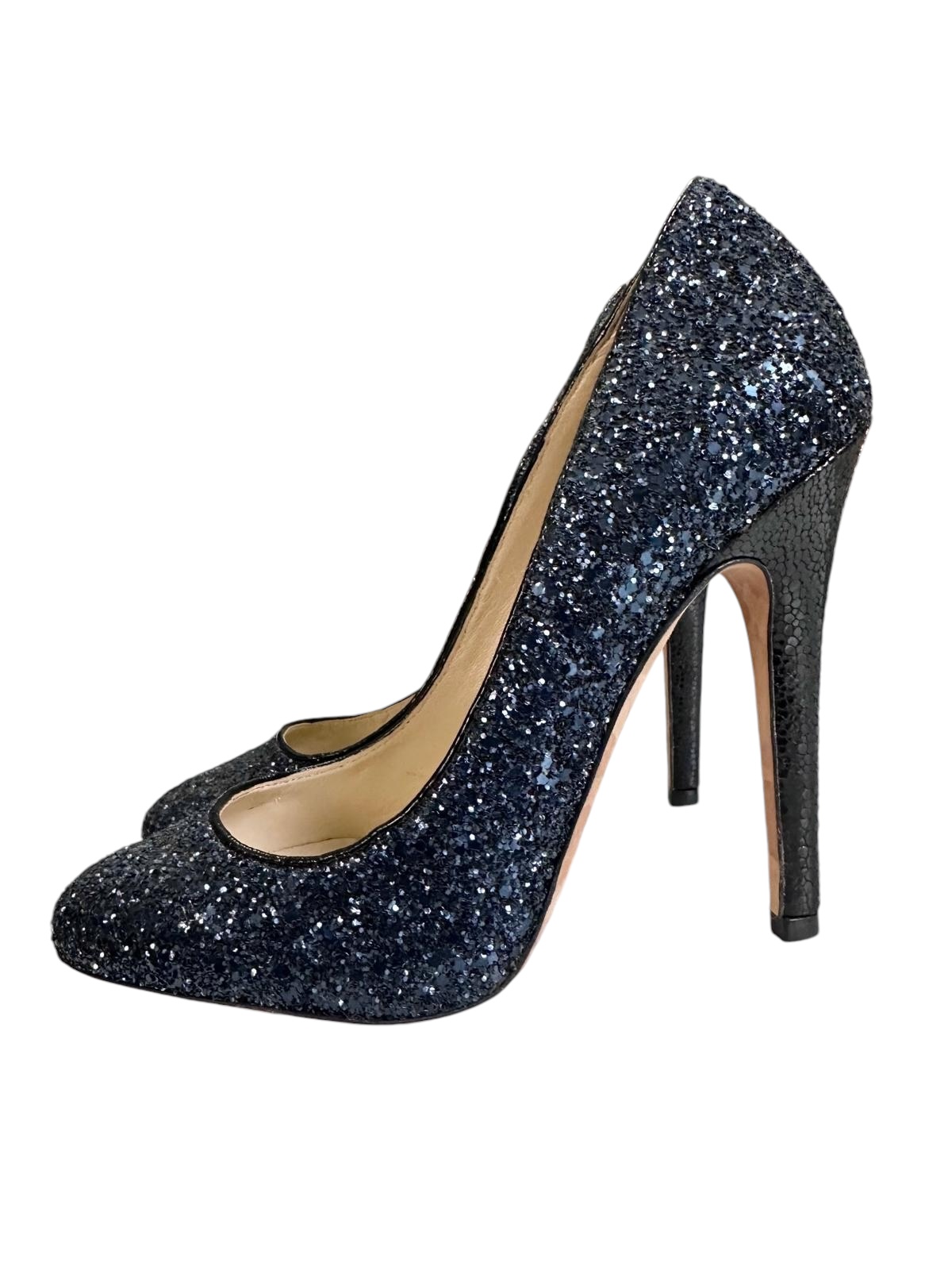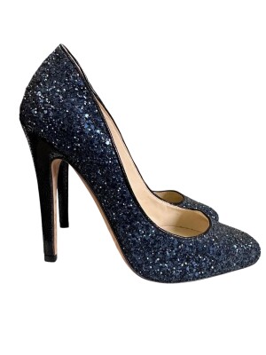 These Jimmy Choo pumps are the epitome of glamour, perfect for brightening up your evenings and special events. Crafted in a sparkling material, they are entirely covered in navy blue/black sequins that catch the light with every step. Their classic and elegant silhouette features a round toe and a dizzying stiletto heel that gracefully elongates the leg.