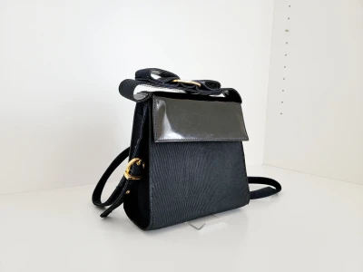 Kleine Ferragamo Tasche aus dunkelbraunem Patentleder und schwarzem Textil. Das Täschchen hat eindeutige Gebrauchsspuren gemäss Bildern, ist aber vollkommen intakt. Der Innenraum ist sehr gepflegt. Nebst der textilen Umhängeschnur wird eine goldige Metallkette aus eigenem Fundus mitgeliefert.