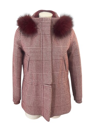 The hood is sumptuously trimmed with opulent burgundy-colored fur, creating a sophisticated color harmony. The silhouette is feminine and functional, with a slightly tailored fit, concealed closure, and practical pockets. Every detail reflects Loro Piana's commitment to craftsmanship excellence. An outerwear jacket that makes no compromises between style and absolute luxury.