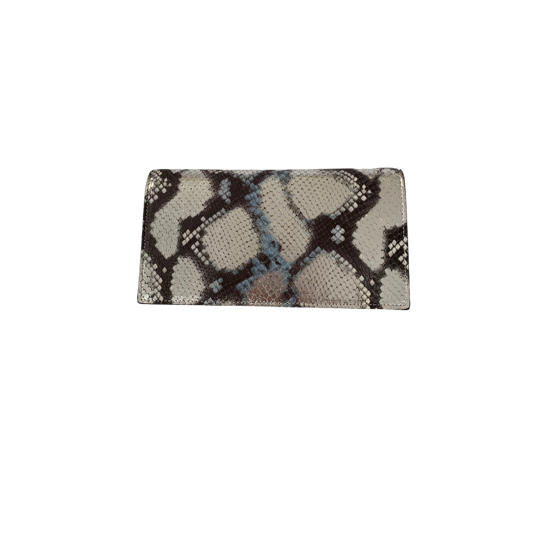 This Christian Louboutin shoulder bag is an exotic and elegant piece, designed for an evening look. It comes in the form of a flap clutch, with a snake pattern in shades of gray, white, and black, embellished with silver highlights.