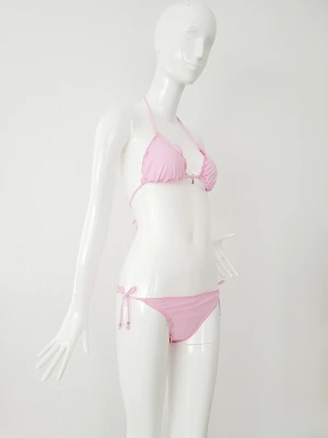 Neuer, ungetragener Banana Moon Bikini in einem schönen Pastellrosa. Die Pads im Oberteil sind herausnehmbar und das Höschen ist gerafft mit seitlichen Schnüren. Banana Moon verwendet für seine Bademode bestes Lycra, was sich in der Qualität dieses Bikinis widerspiegelt. Masse Puppe: 88-64-94 (Grösse S/36), 182 cm gross