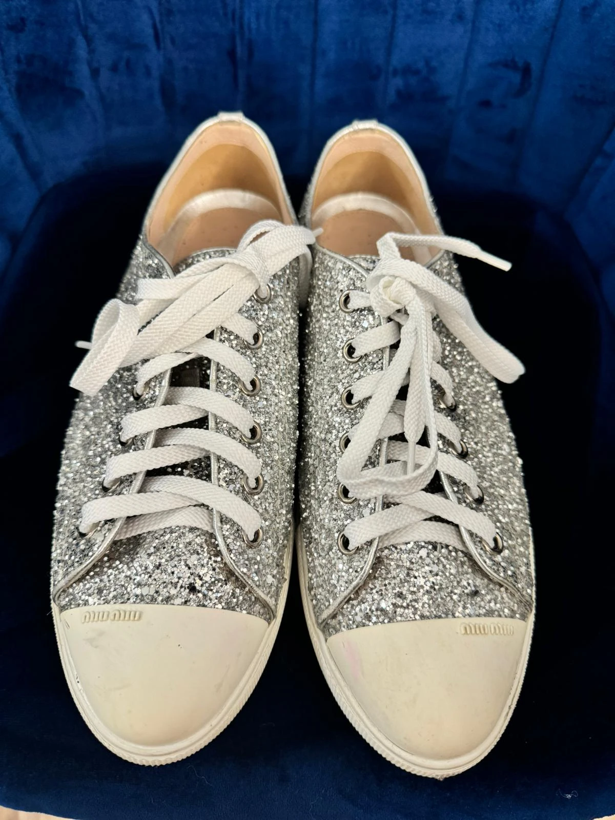 Schöne Sneakers von Miu Miu, gerne getragen, dennoch in einem guten Zustand. Vorne auf der weißen Spitze und seitlich am Gummi diverse Verfärbungen (gut sichtbar im 2./3./4. Foto)