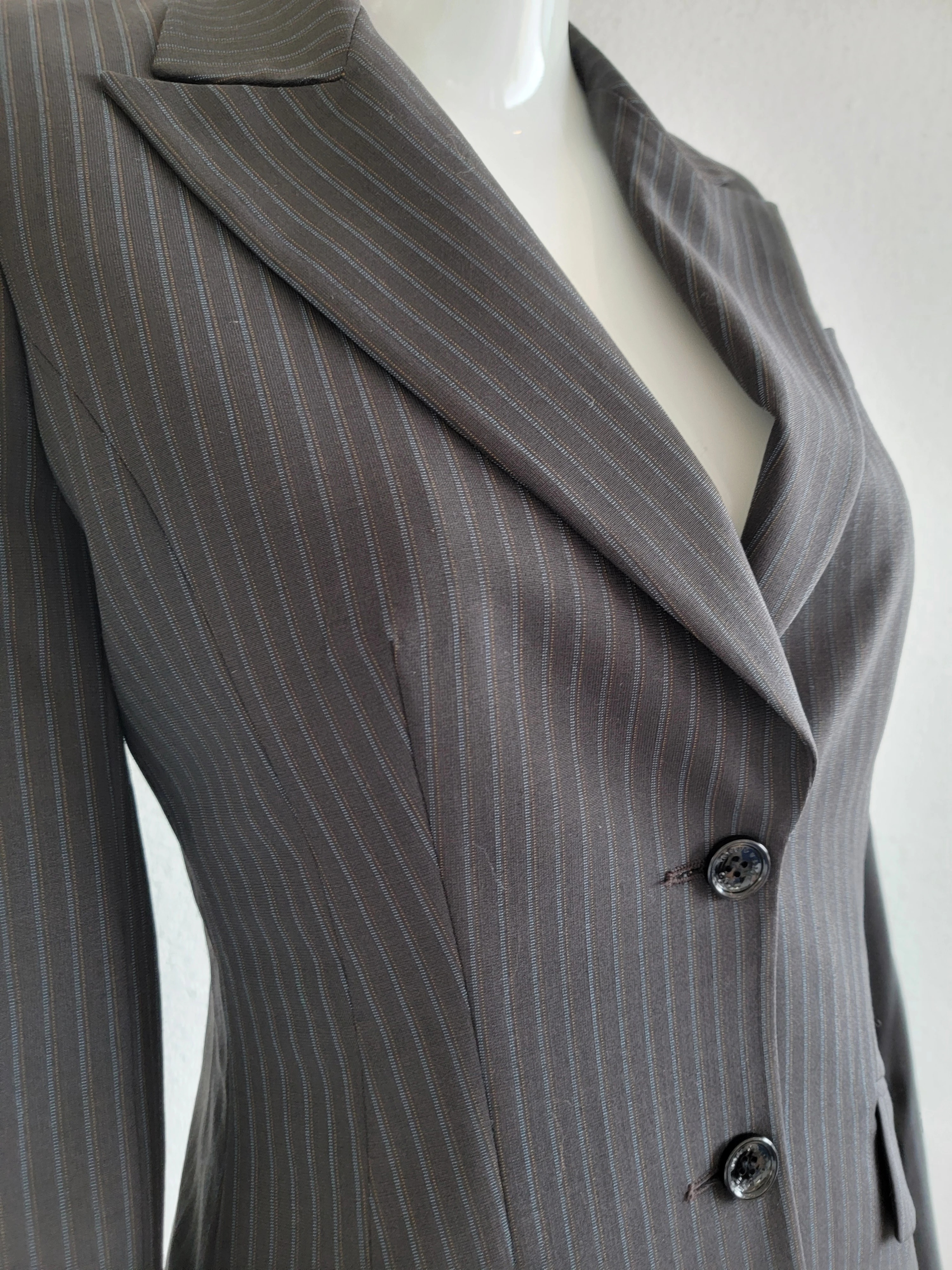 Neuer, wunderschöner Hosenanzug von Dolce & Gabbana. Der Blazer ist tailliert, die Hose gerade geschnitten. Die Grundfarbe ist grau, durch die feinen orangen und blauen Nadelstreifen kann die Farbe auch als leicht bräunlich empfunden werden. Italienische Grösse 40 entspricht einer DE 34/ XS