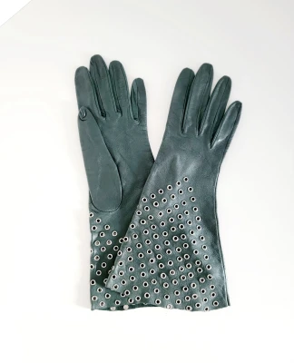 Neuwertige Alaïa Lederhandschuhe in dunkelgrün und mlt Ösen. Minimaler Fleck, kaum sichtbar, gemäss 7. Foto. Neupreis ca. 900.-