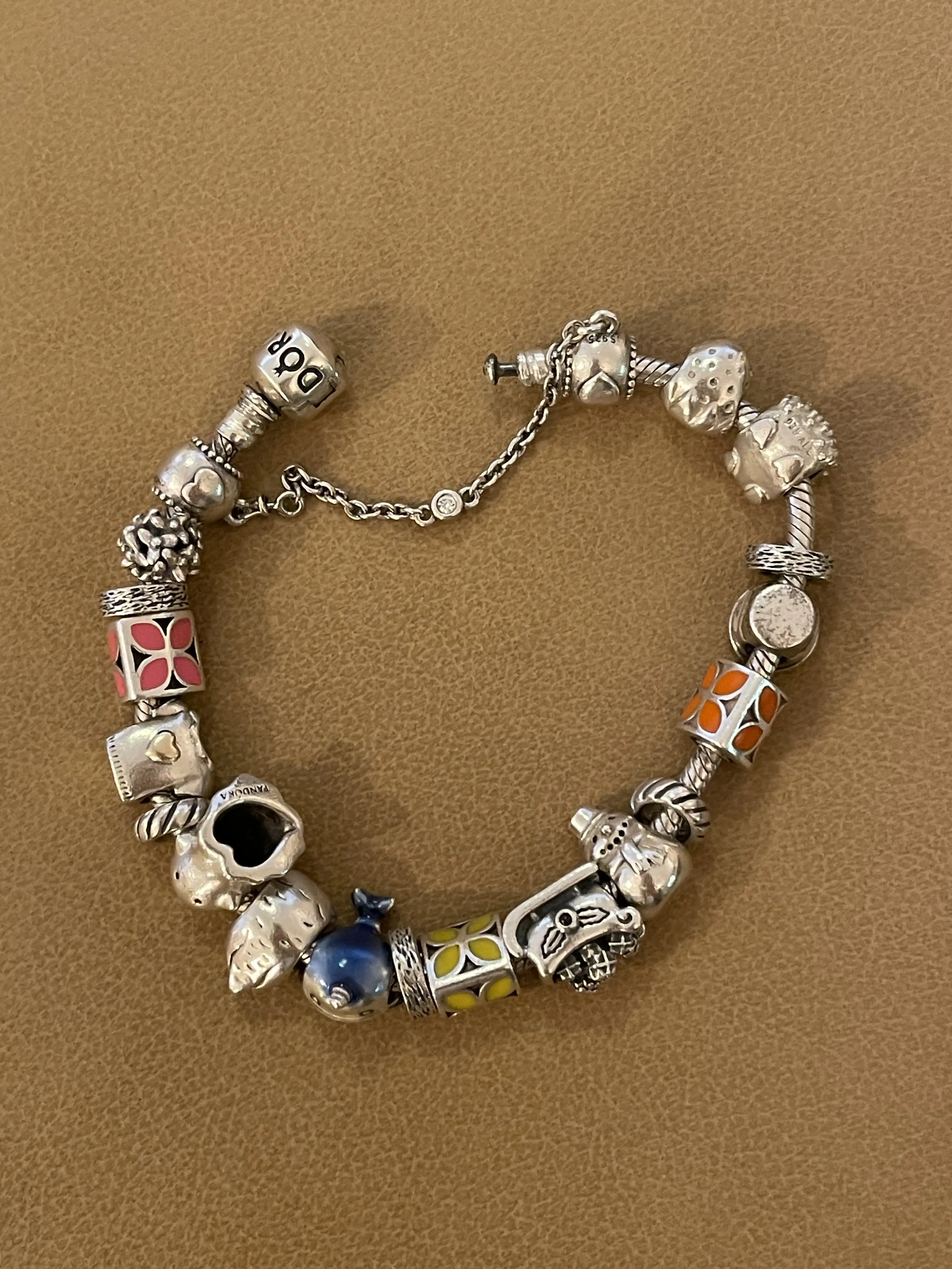 Worn silver Pandora Bracelet, Lenght 19cm with Security Chain. It comes with 13 Charms and 5 Spacer Charms. Freshly cleaned with Silver Cleaning Detergent.