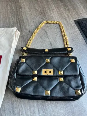 Die Satchel Roman Stud Quilted Crossbody Bag black von Valentino Garavani überzeugt durch einen qualitativen und exquisiten Stil. Hochwertiges Außenmaterial aus Glattleder in schwarz mit glatter und gesteppter Oberfläche Mit lässigen, goldfarbenen Metalldetails und rockigen, goldfarbenen Nieten bestückt Ein abnehmbarer Henkel aus robustem Leder (ca. 34 cm lang) für mehr Varianz beim Tragen Zusätzlich ein verstell- und abnehmbarer Schulterriemen aus schmückender Metallkette (ca. 66 cm bis 112 cm lang) Maße (B x H x T): ca. 27 cm x 18 cm x 8 cm Neupreis CHF 3200,-