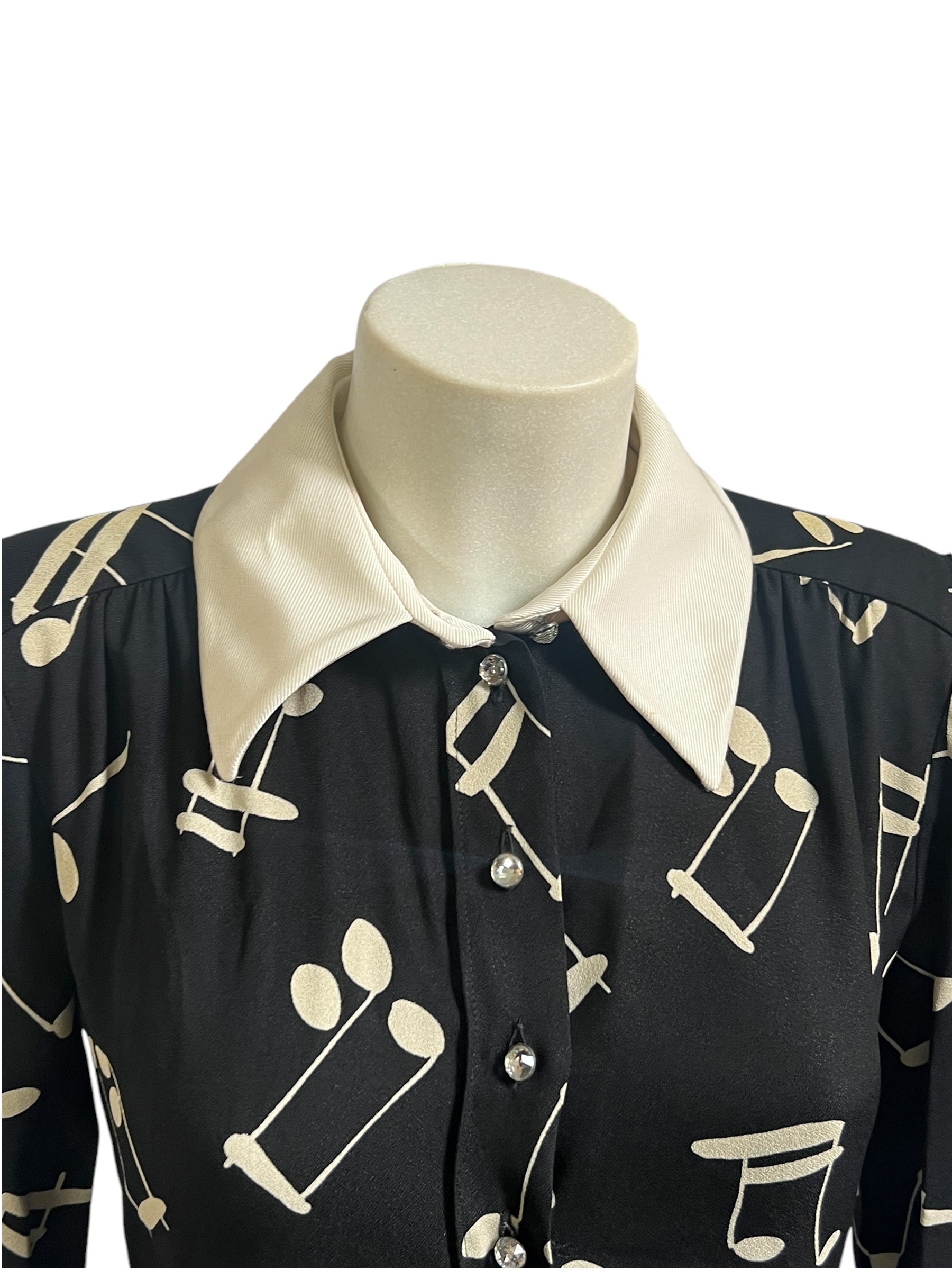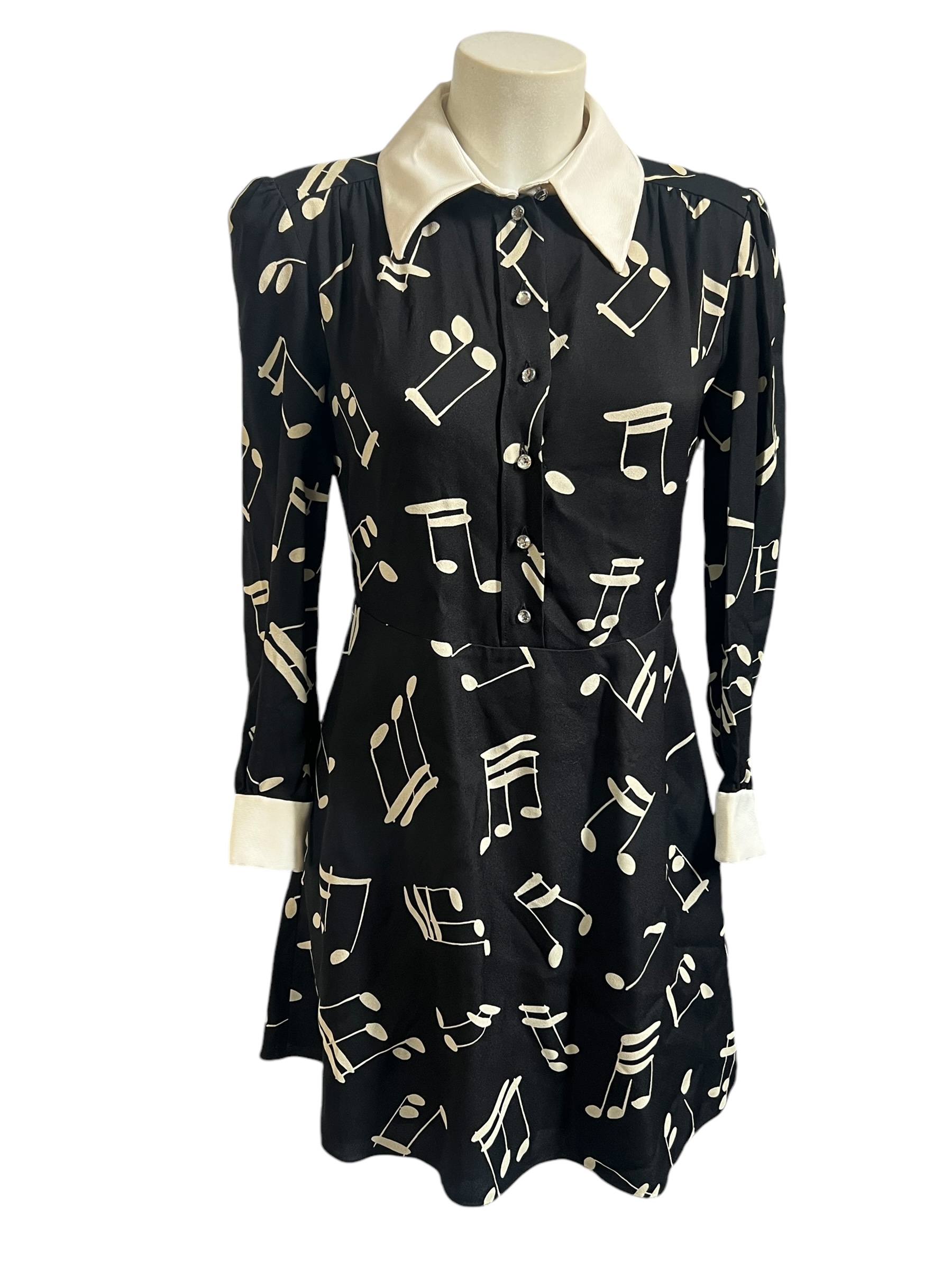 Crafted from high-quality silk, this dress features a unique and playful print of white musical notes on a black background. The contrast is strong and elegant, giving a bold character to the garment. The cut is feminine, with a button placket on the front and a defined waist that flares into a fluid skirt.