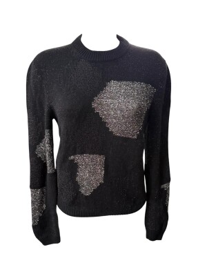 Adopt a chic and bold look with this Saint Laurent sweater. Crafted in high-quality black knit, often in wool or wool and cashmere blend, this round-neck sweater features modern panels adorned with shimmering silver sequins. Perfect for adding a touch of sparkle to a sophisticated daytime outfit or for a casual evening, this garment perfectly embodies the timeless rock-chic aesthetic of the YSL House. A collector's item for an instantly luxurious look.