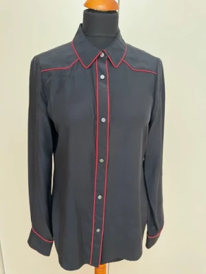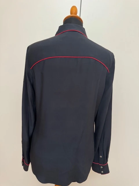 schwarze Seidenbluse, rot gerandet