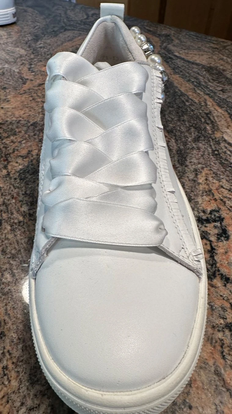 Diese Schuhe zeichnen sich durch ihr elegantes Design aus: Weißes Lederobermaterial, das mit glänzenden Perlen entlang der Seiten geschmückt ist. Die Perlen verleihen den Sneakern eine edle, feminine Note, die sie perfekt für den Alltag oder auch für schickere Anlässe macht. Zusätzlich bieten diese eine weiche Innensohle und eine flexible, aber robuste Sohle. Die Schuhe sind nur zuhause anprobiert worden und wurden nie getragen (siehe Bilder)