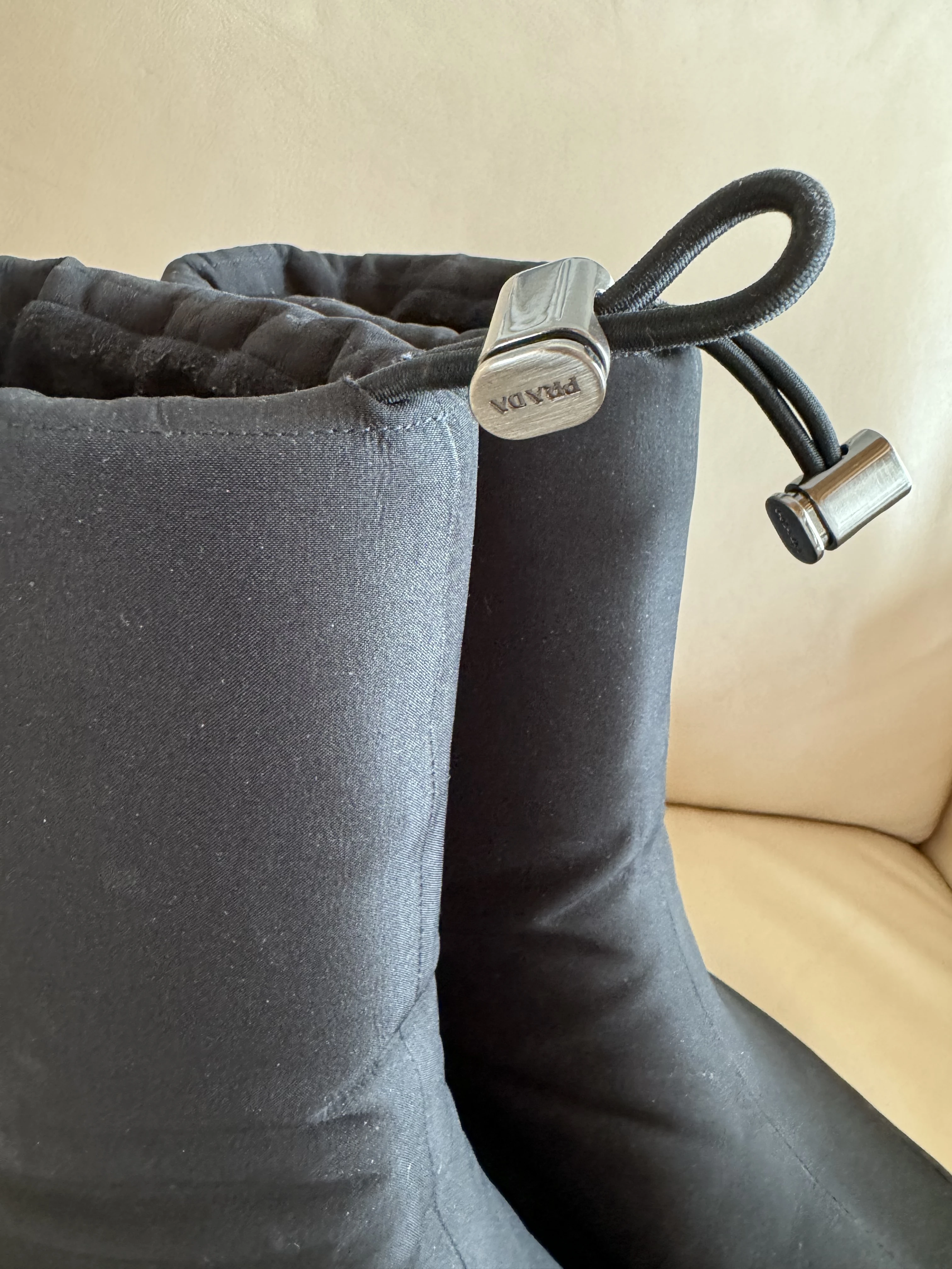 Neuwertig, einmal getragen und wegen Fußverletzung nie wieder. Textile Oberfläche, Gummisohle. Schaft eher schmal geschnitten. Nicht gut für feste Waden geeignet