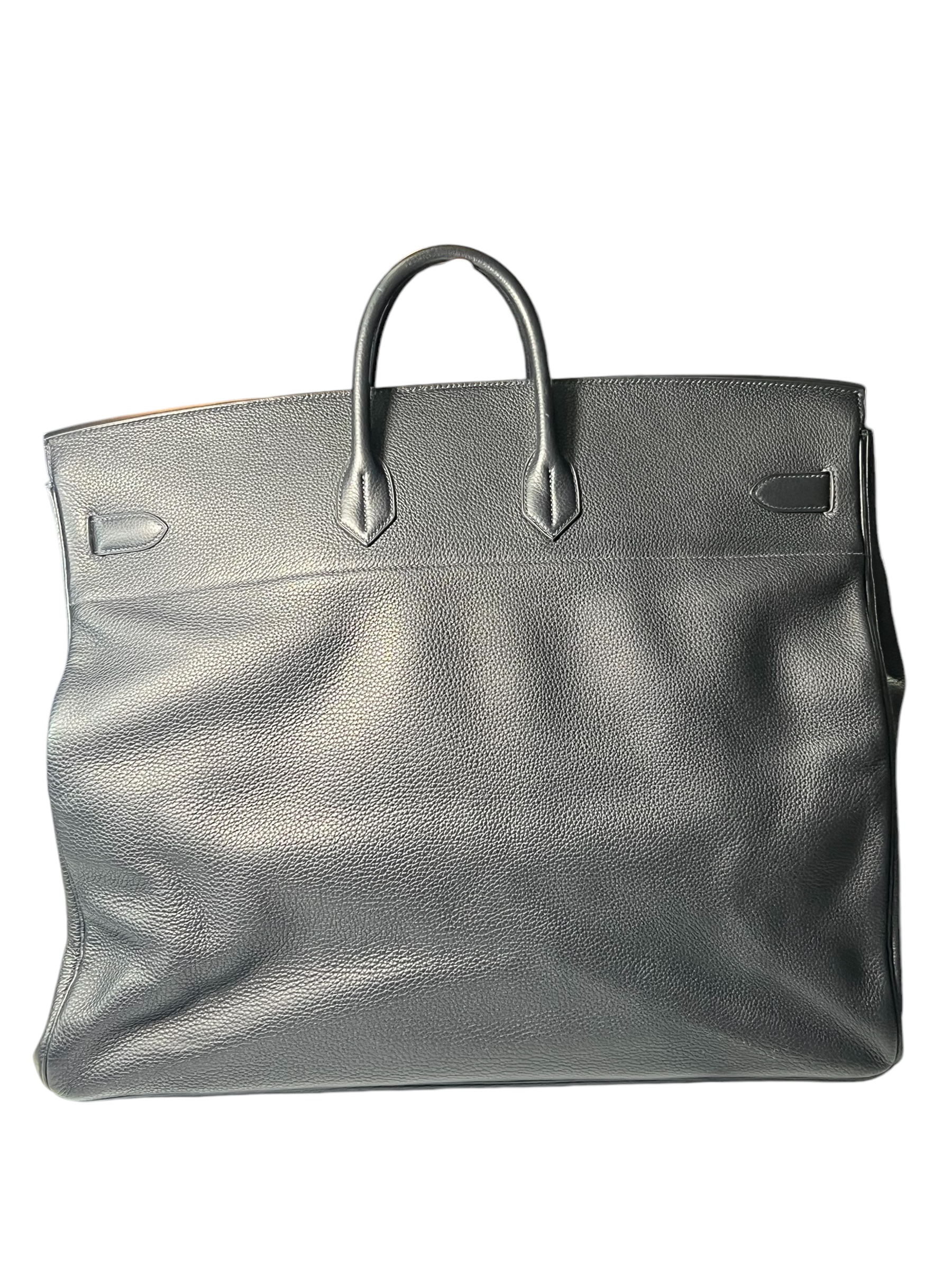 This Hermès bag, an XXL Birkin size, stands out for its imposing stature and timeless elegance. Crafted in black grained leather, it features the iconic trapezoidal silhouette of the house, with its flap, two rigid handles, and closure straps.