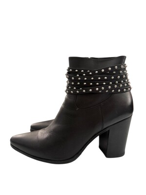 Crafted from smooth and supple black leather, they boast a timeless and powerful silhouette. The pointed toe elongates the leg, while the thick block heel ensures a stable and comfortable stride, full of confidence. But what elevates these ankle boots to iconic status is their spectacular harness of studded straps. Multiple leather straps wrap around the ankle, each generously adorned with round silver metal studs.