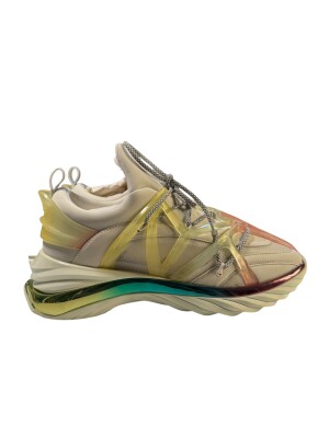 Assert your style with these avant-garde Jimmy Choo sneakers. Their silhouette is defined by an oversized and wavy sole, with a base adorned with an incredible metallic finish reflecting rainbow colors. This colorful and changing effect captures the light with every movement.