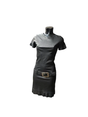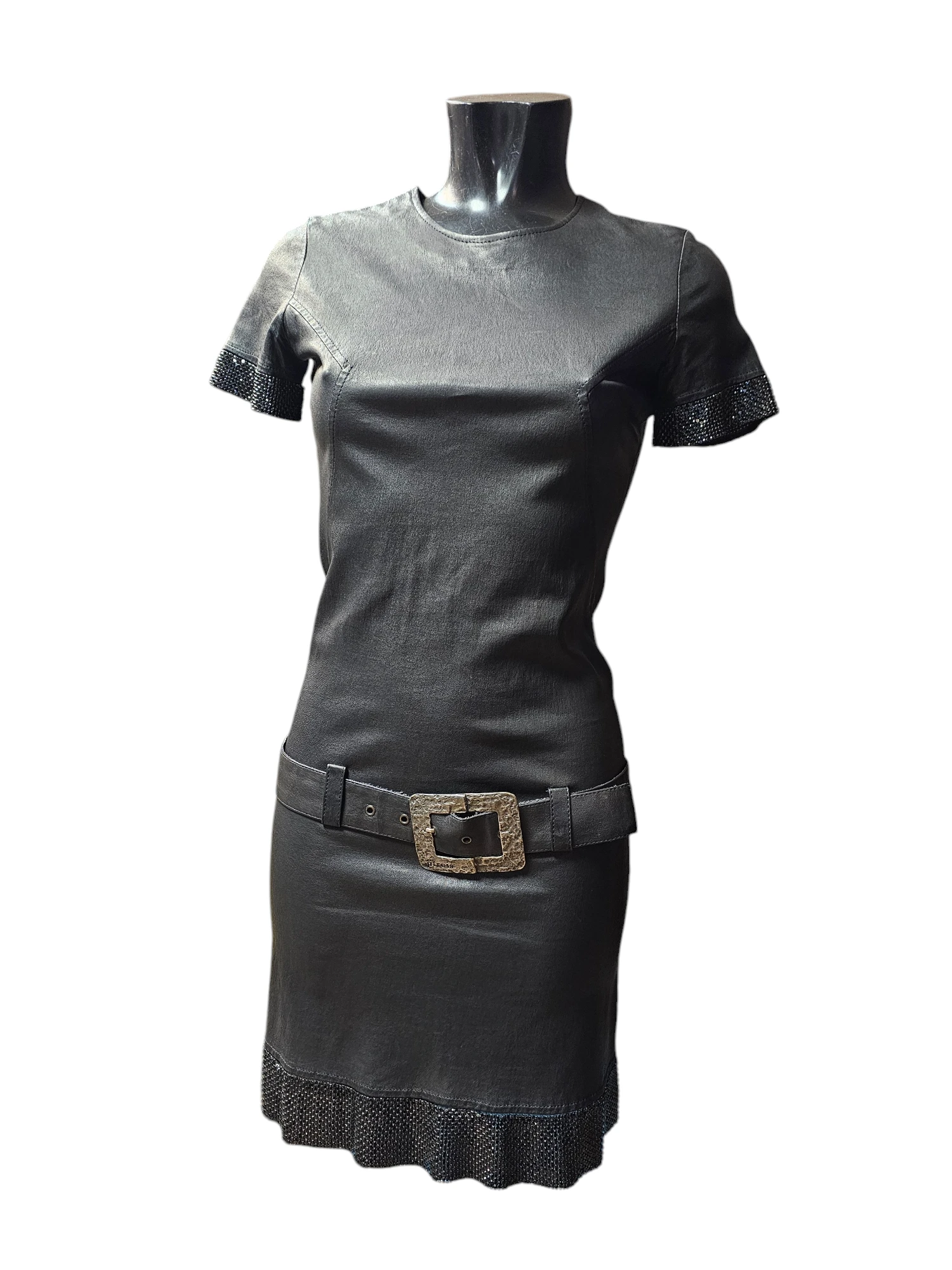 Leather Mini dress with shiny details by Jitrois Lammb Strechy leather Belt Glitter stones (crystals mesh) on the bottom and around short sleeves Round neckline Zipp closure on the back Size FR 36 Excellent condition NP.3.200