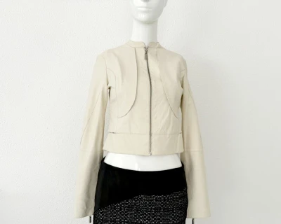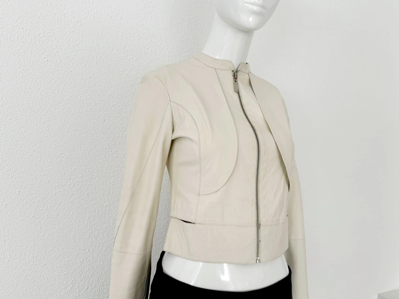 Wunderschöne Jacke aus weichem Leder von der bekannten Brasilianischen Designerin Giuliana Romano. Luxuriös verarbeitet mit extravaganten Details und Cut-outs. Die Farbe ist ein off white und geht leicht ins Beige über.