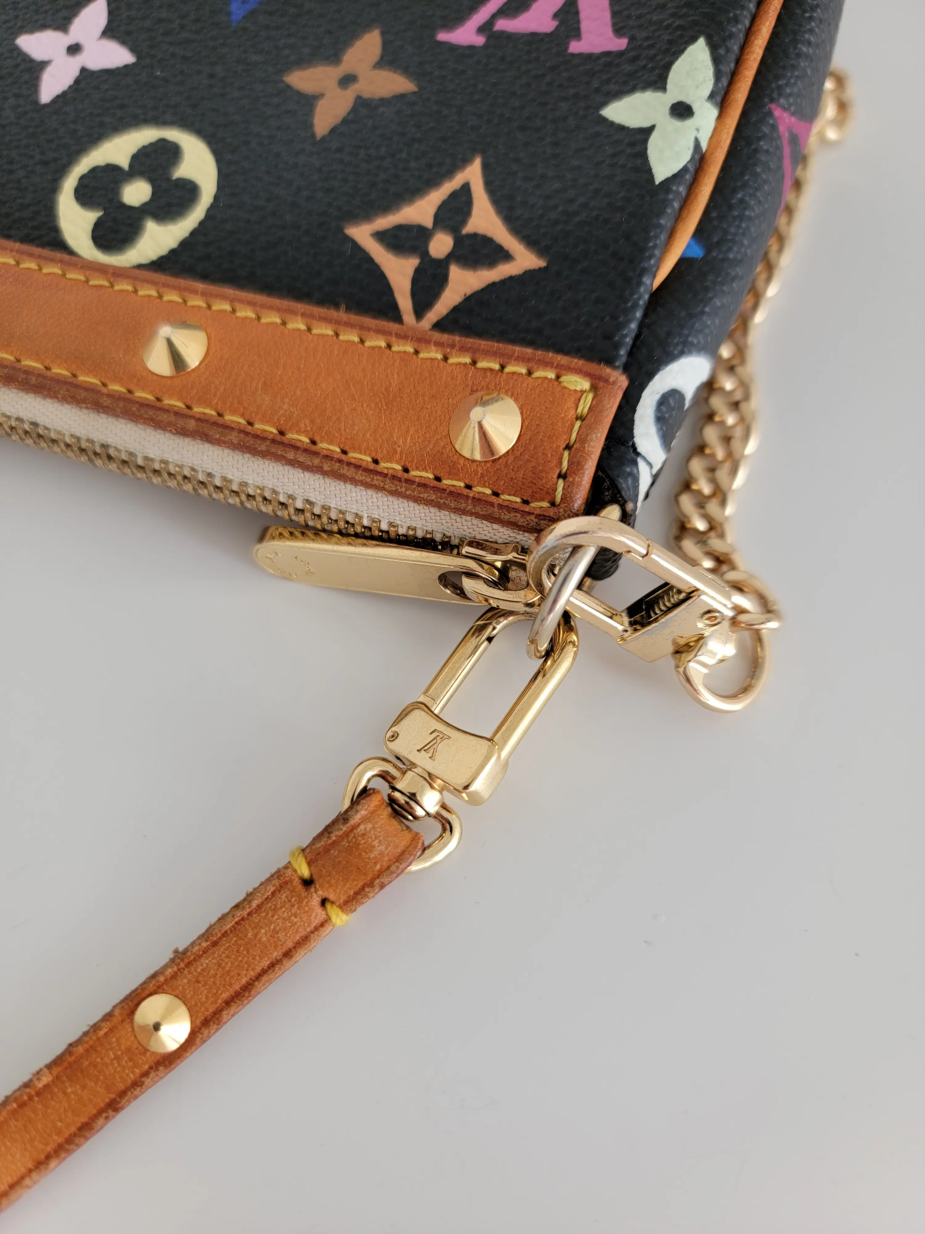 Ikonische Louis Vuitton x Takashi Murakami Accessoires Pochette. Diese Pochette ist das Vintage Original aus dem Jahr 2002, das in der aktuellen LV Kollektion ein Revival erlebt. Das Canvas-Leder ist in sehr gutem Zustand, ohne sichtbare Gebrauchsspuren. Das braune Leder der Säume und des Riemens hat über die Jahre eine Patina bekommen, ist aber dennoch in äusserst gutem und gepflegtem Zustand. Innenraum ist sehr gepflegt. Das Entrupy Zertifikat ist dabei und muss hier nicht extra gekauft werden.