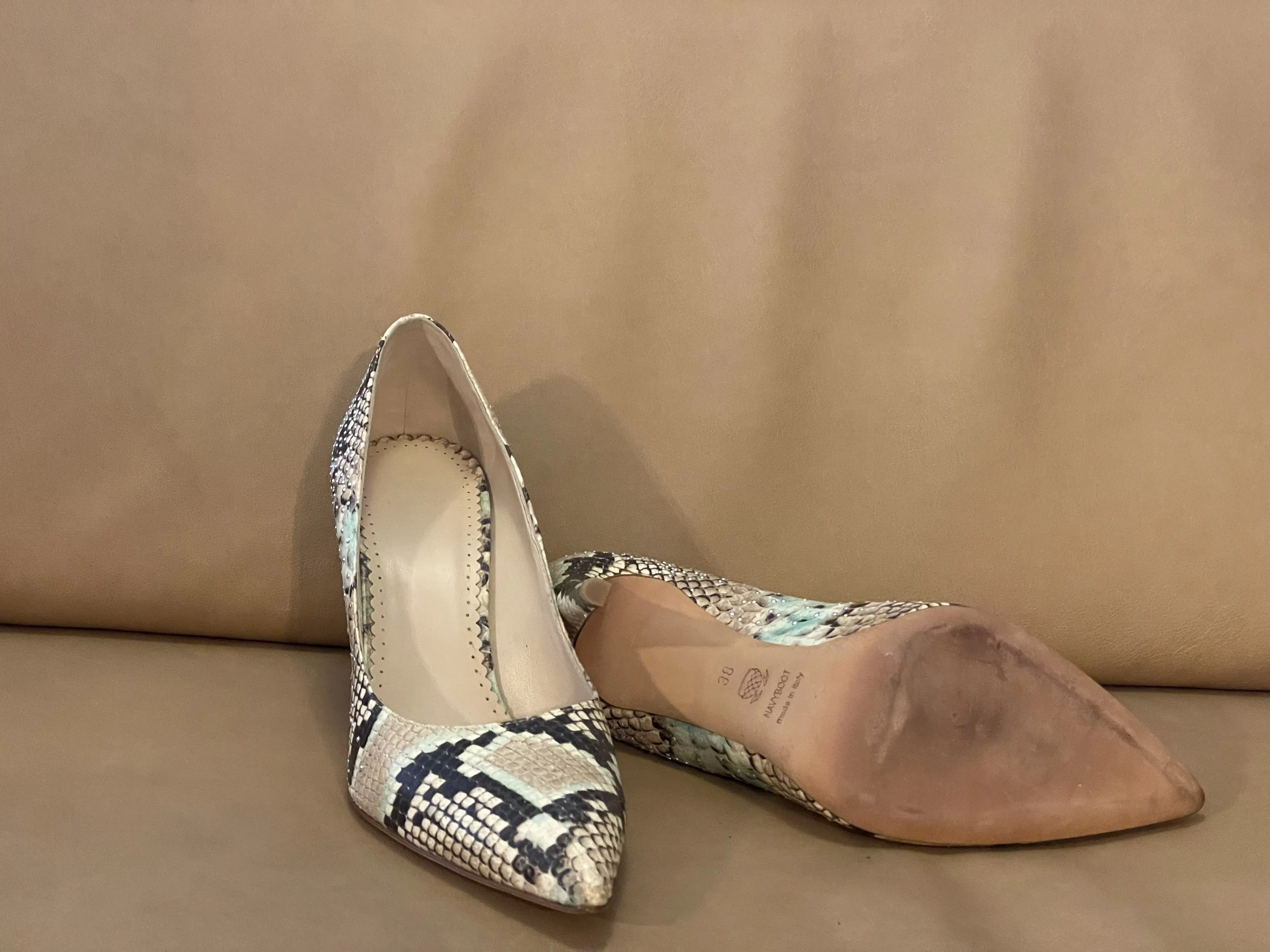 Never worn outside, light marks on the Soles. Navyboot Leather High Heels in snake print Optics with little Studs around the heel and down the Side. Made in Italy. Size: 39 Heel Height: 9 cm
