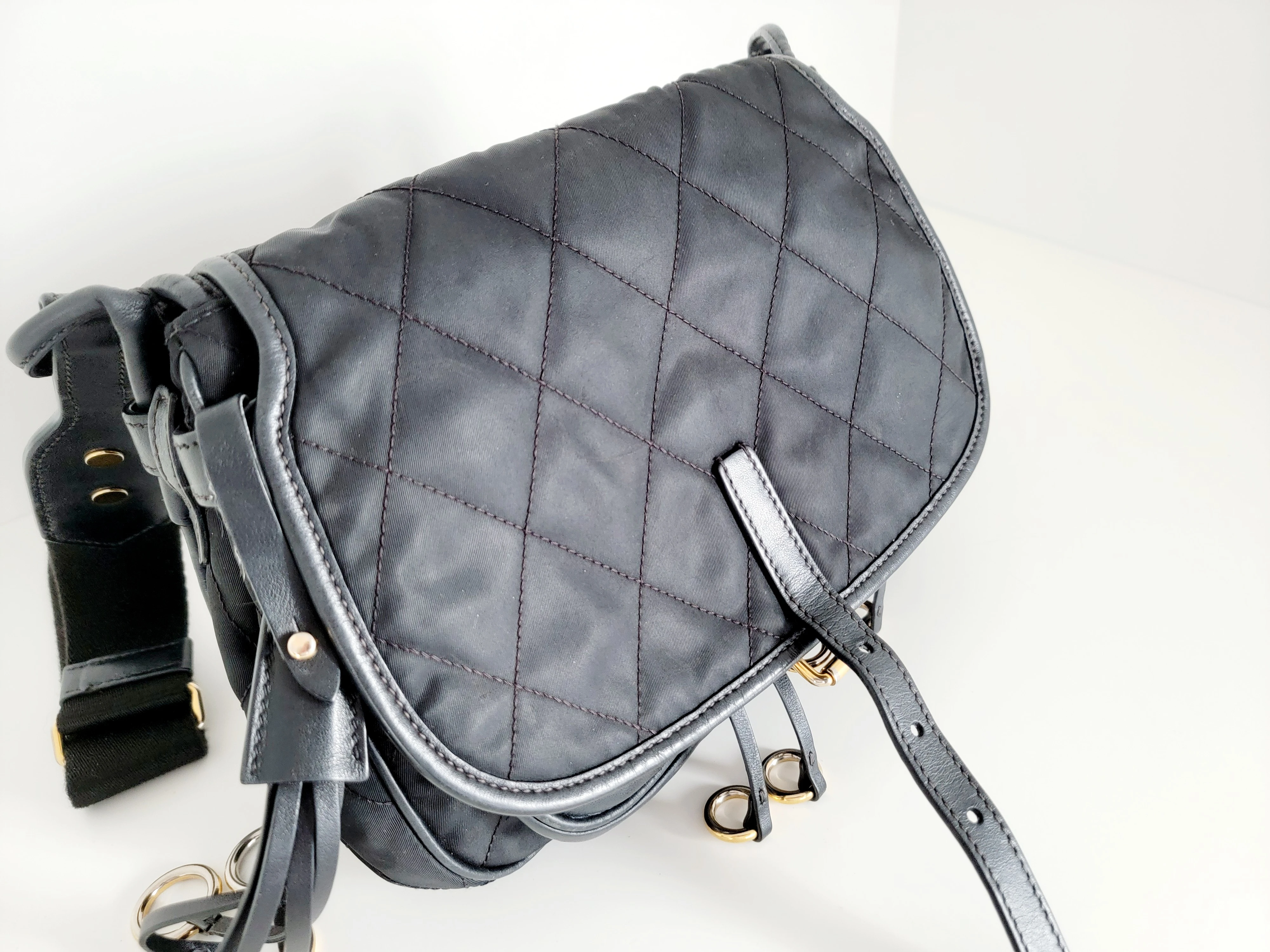 Diese Corsaire Tasche von Prada ist gut erhalten und weist insgesamt kleine Gebrauchsspuren auf. Die textile Vorderseite (6. Foto) ist leicht verbleicht. Bild 5: Der Kleber löst sich an einer Stelle leicht ab und durch einige Nähte drückt weisses Futterstoff durch. Der Innenraum ist sehr gepflegt, ohne Gebrauchsspuren.